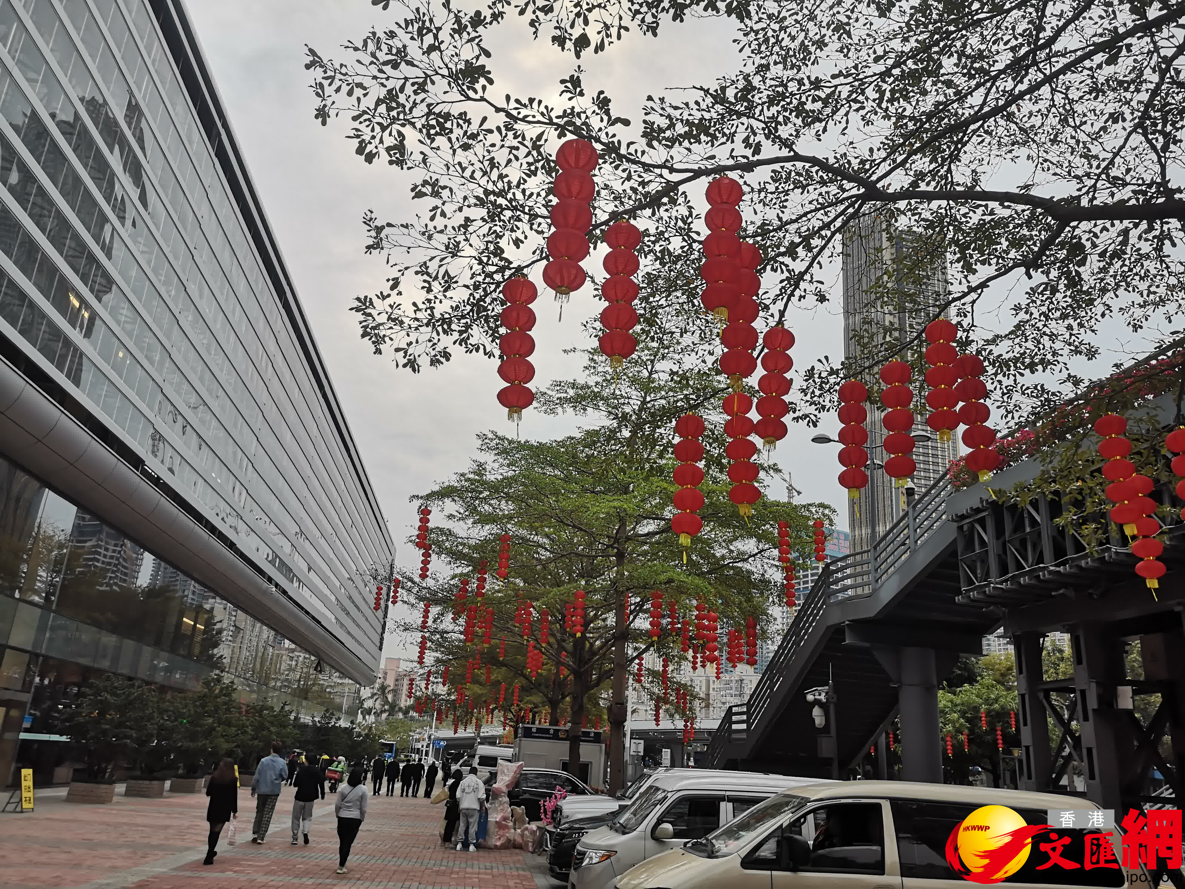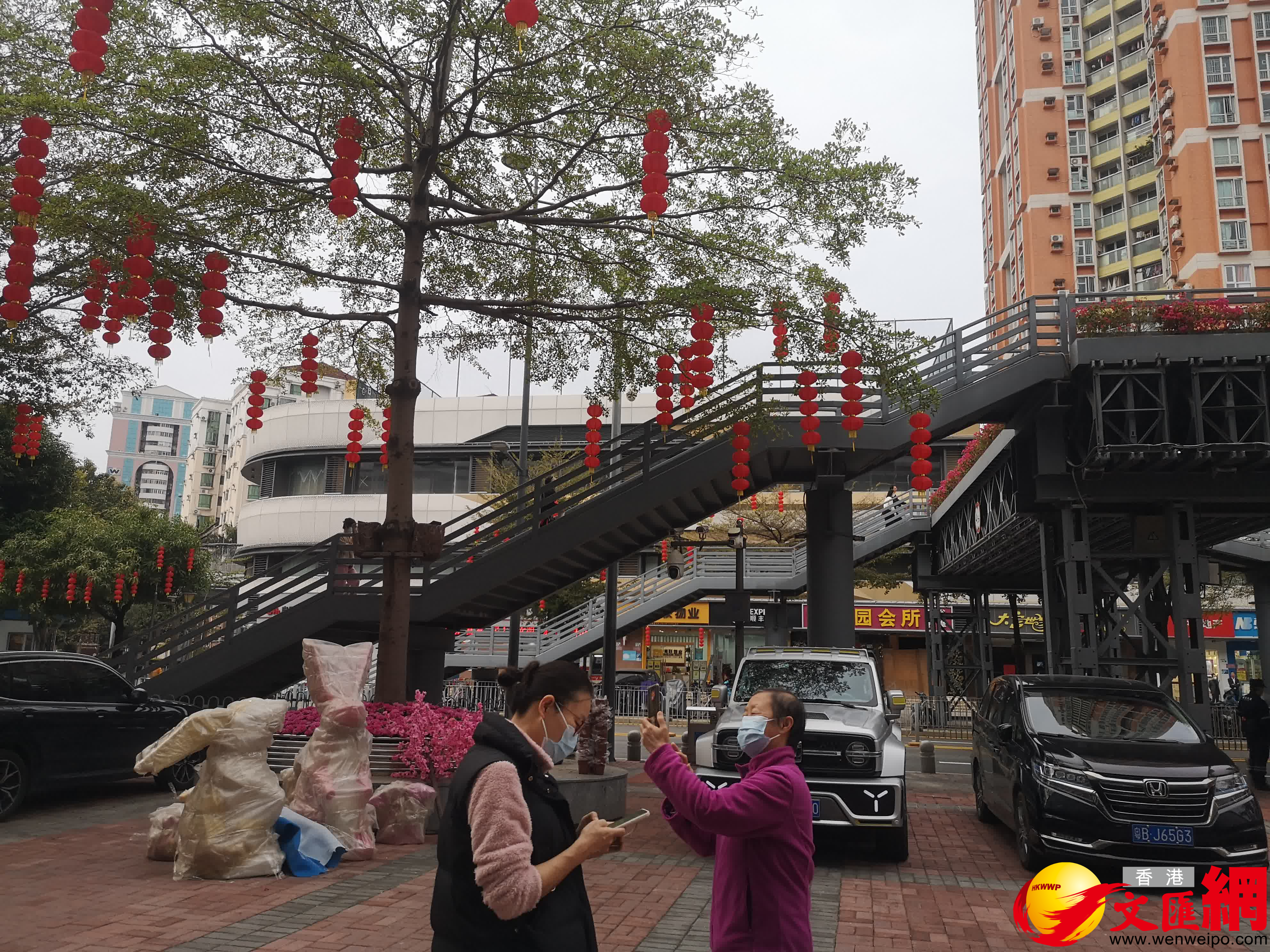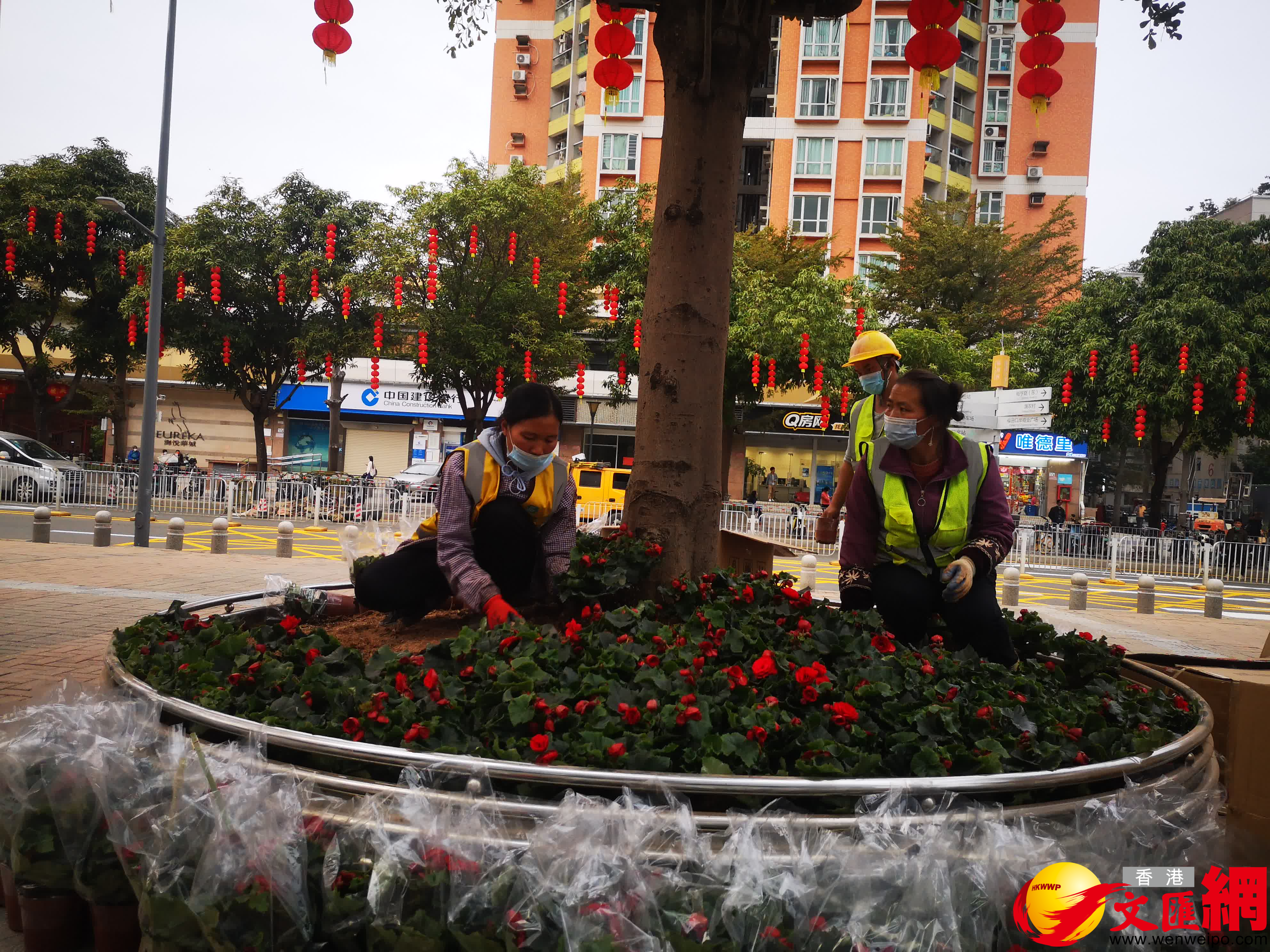 (香港文匯網記者 石華 深圳報道)記者今日(7日)下午在福田口岸看到,外圍的花卉基本布置完畢,綠化樹上也掛上了燈籠,路過市民紛紛拍照留念。