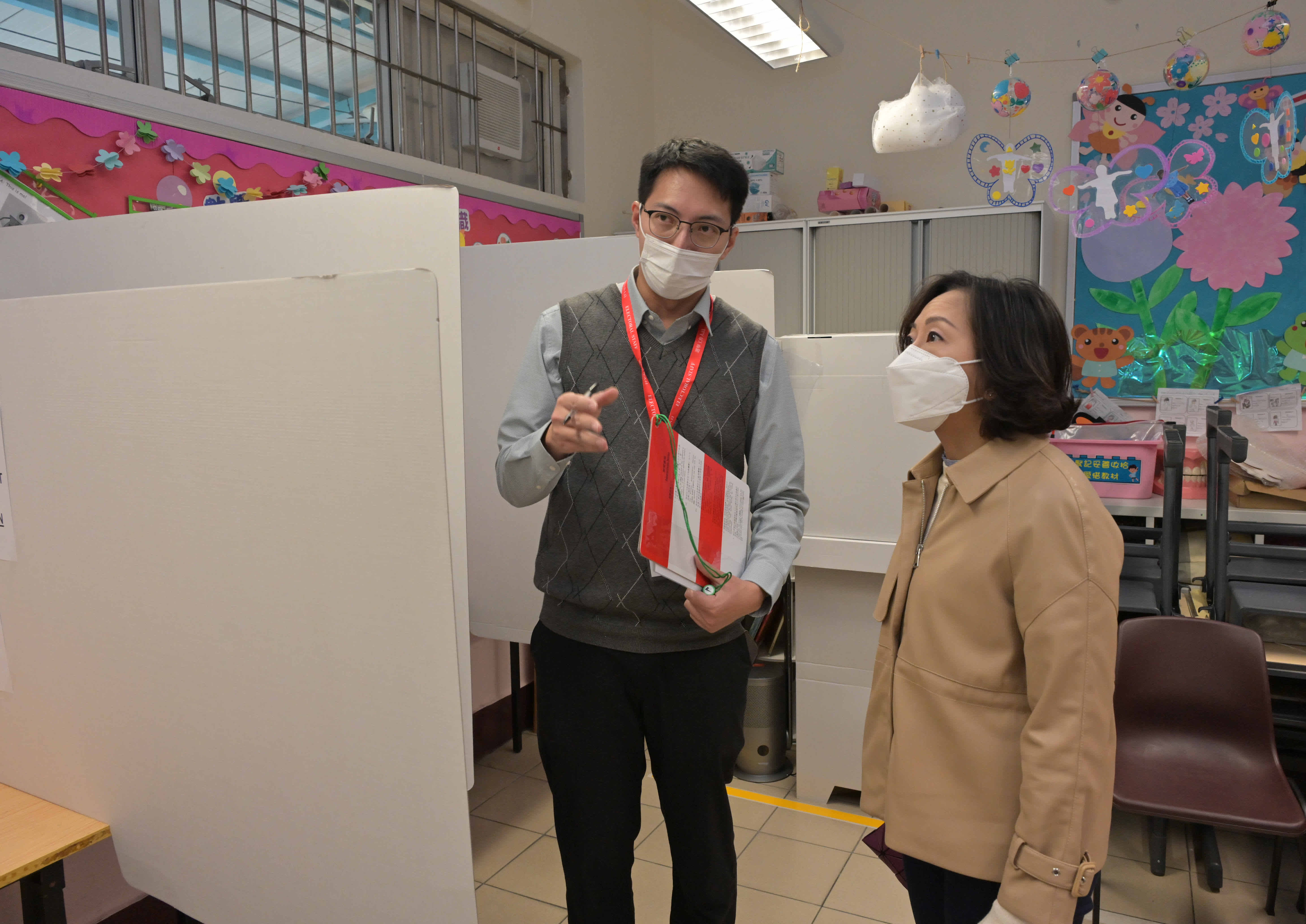 民政及青年事務局局長麥美娟巡視設於北區粉嶺公立學校的投票站。她表示,選民須按投票通知書上列明的日期、時間和地點前往指定的投票站投票,同時必須帶備身份證明文件或法定的替代文件正本以申領選票。麥美娟亦呼籲所有合資格的選民齊來投票,選出心目中賢能之士,協助大家建設和諧美好的鄉郊社區。