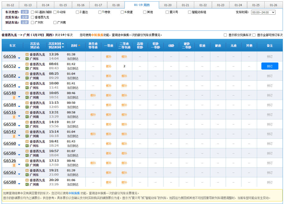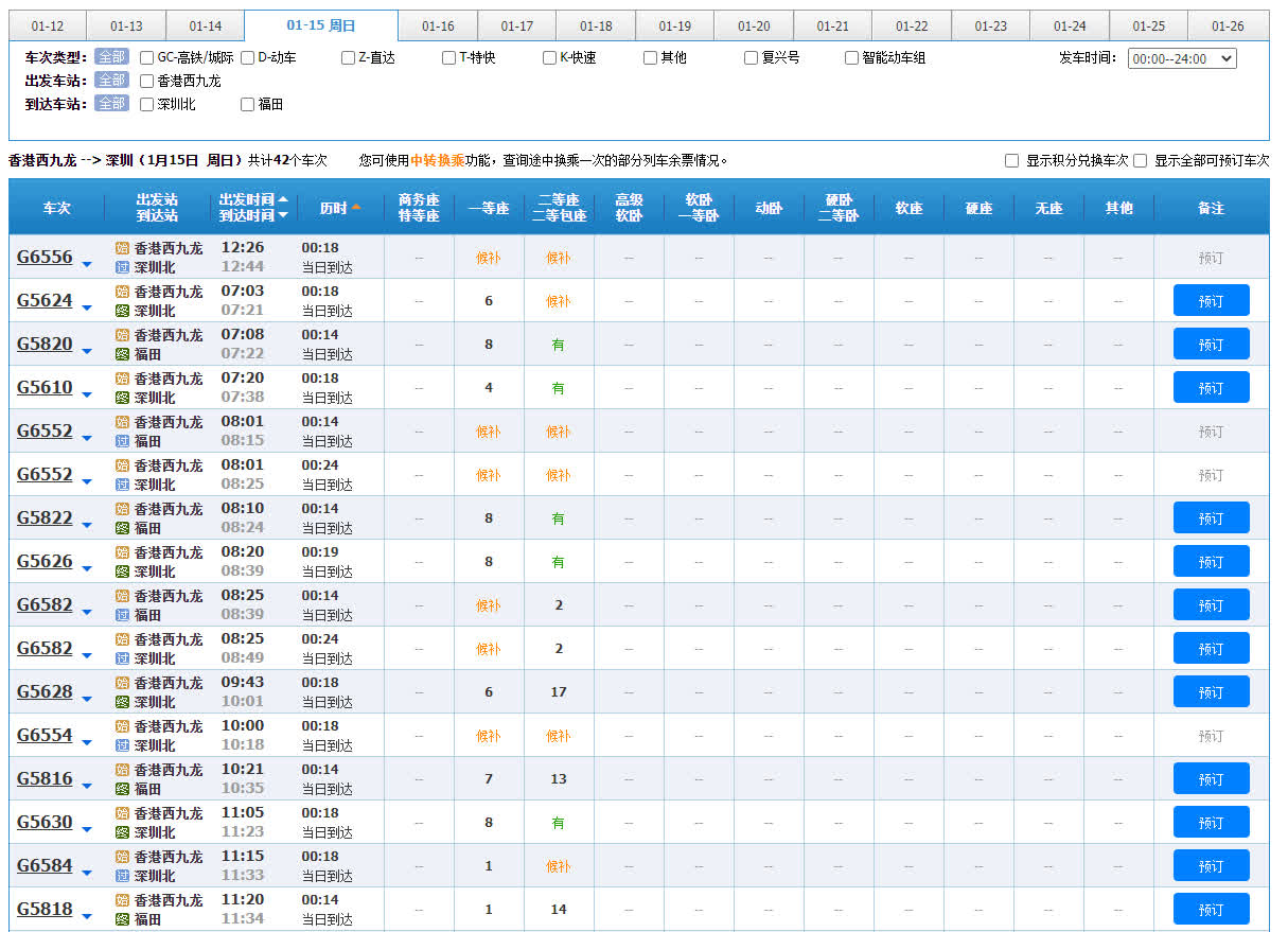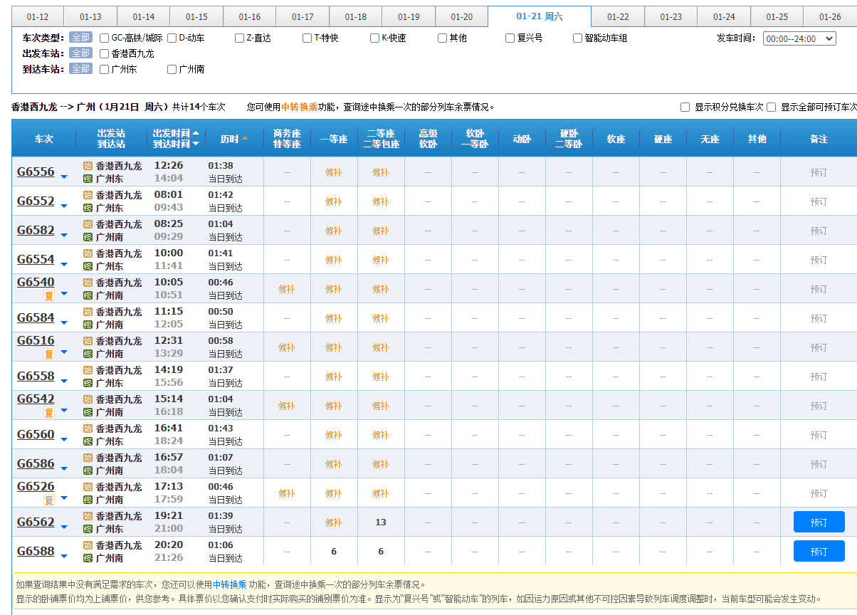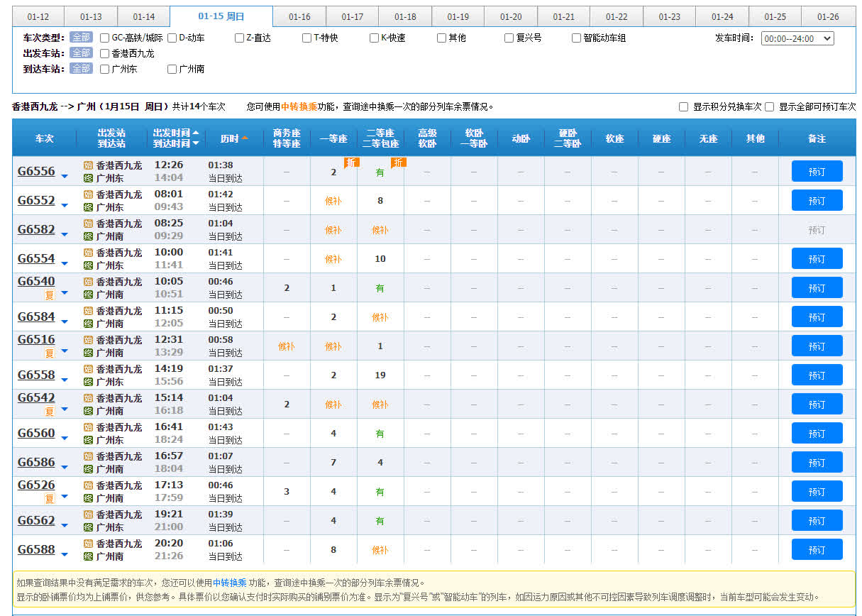 記者成功購買了1月15日早上西九龍經深圳北到達廣州東的高鐵票。記者發現當日西九龍至深圳北的列車有足夠餘票,反而是深圳到廣州的車票較短缺,僅買到無座票。