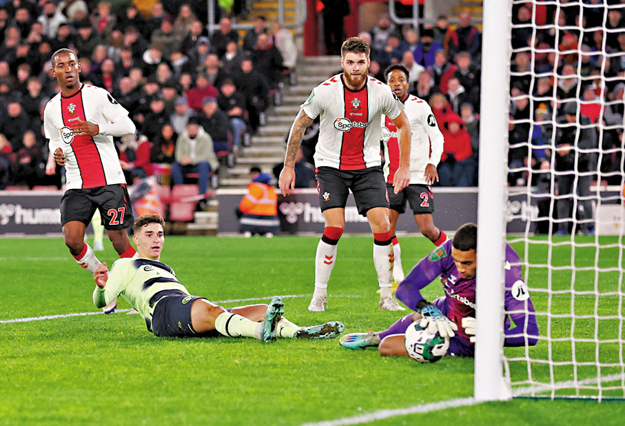 曼城於香港時間12日凌晨的英聯盃8強戰作客英超墊底的修咸頓,繼續收起艾寧夏蘭特及奇雲迪布尼兩大王牌,雖然場面仍然佔據優勢,不過中後場卻出現多次失誤,主隊由馬拿及迪贊尼普在23分鐘及28分鐘短時間內連入兩球。下半場曼城作出5個換人調動,包括夏蘭特及迪布尼相繼入場,但終究無法撕破一心死守的修咸頓防線,緣盡4強,四線作戰先失一盃。
