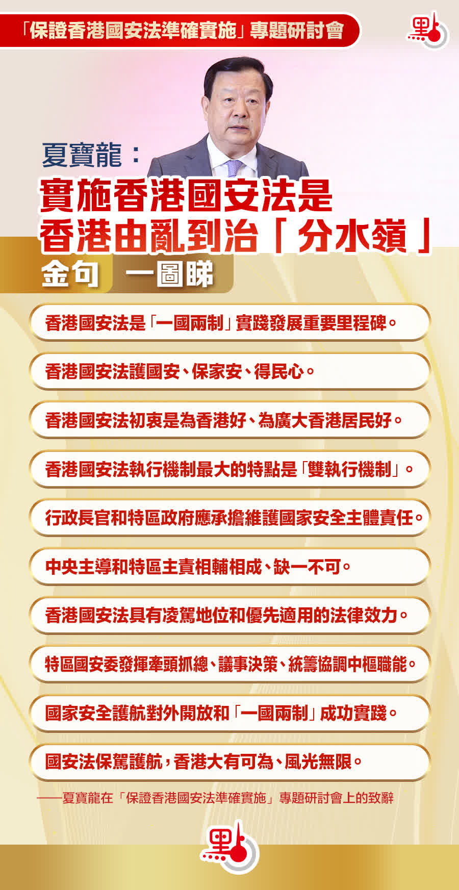 大公文匯全媒體報道:全國港澳研究會主辦的「保證香港國安法準確實施」專題研討會13日在北京舉行,全國政協副主席、國務院港澳事務辦公室主任夏寶龍出席研討會並致辭。夏寶龍表示,香港國安法護國安、保家安、得民心,已成為香港繁榮穩定的「守護神」。更好發揮香港國安法保駕護航作用,香港在中華民族偉大復興進程中必將大有可為、風光無限。