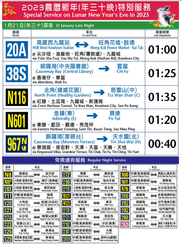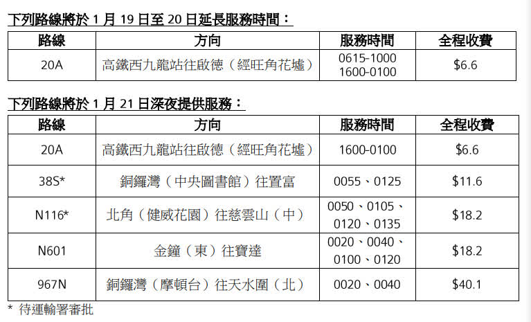 目前增設的路線包括:20A由高鐵西九龍站往啟德、38S由銅鑼灣中央圖書館往置富、N116由北角健威花園往慈雲山中、N601由金鐘東往寶達,及967N由銅鑼灣摩頓台往天水圍北。20A線亦會在年廿八及年廿九延長服務時間,部分路線仍有待運輸署審批。