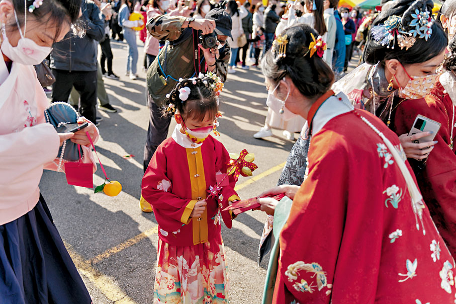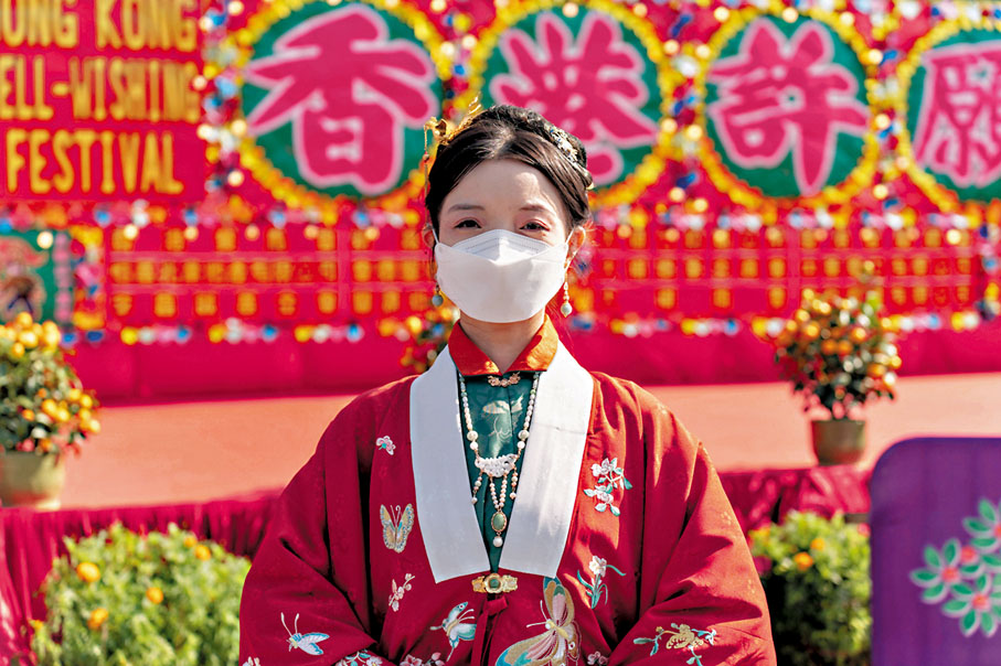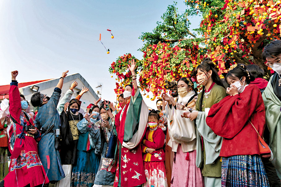 正月初三艷陽高照,「漢服日主題攝影活動」吸引逾60名身穿漢服、熱愛中華文化的青年來到林村,沿途向在場市民展示及介紹中國傳統服飾——漢服。許願樹下,「同袍」(漢服愛好者)一齊拋寶牒祈願,藉此祝願祖國國泰民安、風調雨順,並期盼香港社會盡快復甦,重現活力、生機與朝氣。林村許願廣場主席林祿榮表示:「今年香港許願節增加了漢服巡禮這一個非常有特色的環節,數十位穿着漢服的參加者在會場穿梭走過,在場人士讚賞不已,尤其是攝影愛好者更是雀躍萬分。漢服活動有助宣揚中華文化,值得推廣!」香港文匯報記者還在活動現場訪問了幾位青年「同袍」,聽他們講述因熱愛漢服而鑽研中華歷史文化,在現代都市中探尋傳統之美的故事。