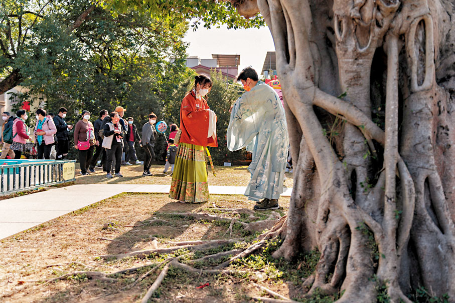 大埔林村於今年農曆新年期間復辦「香港許願節」,吸引眾多市民前往參與傳統節慶活動,在許願樹前拋寶牒、放蓮花燈祈福,為新一年許下心願。林村今年首次於許願節中糅合漢服元素,與本地青年漢服團體「丹青承南」合作,於正月初三舉辦「漢服日主題攝影活動」,廣邀全港漢服愛好者與專業攝影團體於林村各景點拍攝宣傳素材,期望藉此向海內外宣傳拋寶牒等富本地特色的中國傳統習俗,為帶動香港旅遊業復常盡一分力。◆文:香港文匯報記者 張岳悅 攝:香港文匯報記者 黃金源