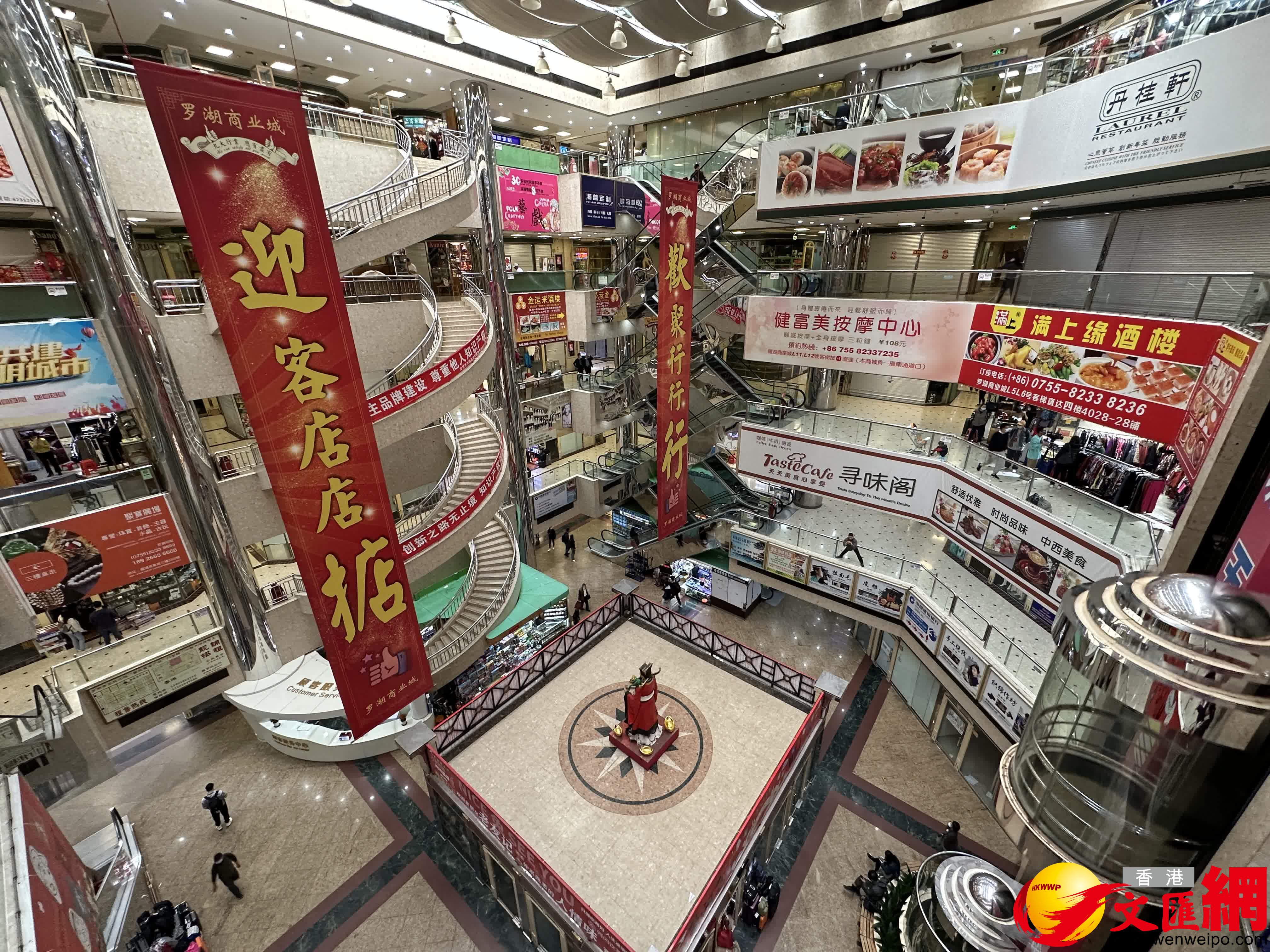 記者走訪發現,羅湖商業城地下樓層較多飲食,而一樓有銀行、美甲店、精品店,二樓多數為珠寶飾品,其餘的樓層比較多精品店,而在7樓的酒樓餐廳都未開門。