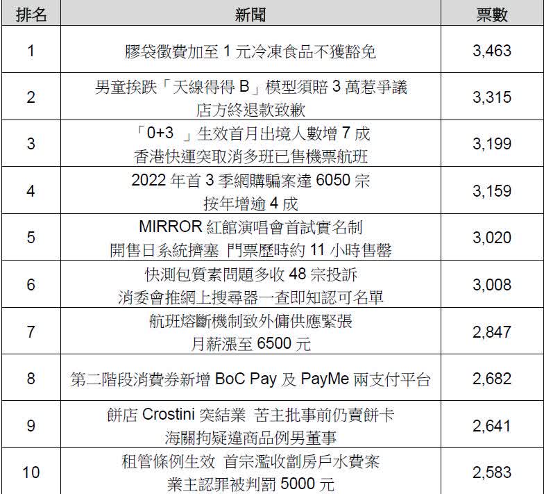 大公文匯全媒體報道:消委會今日(6日)公布「虎年十大消費新聞」結果,影響全港市民的新膠袋徵費以3463票登上榜首,多宗疫情相關的新聞均進佔十大,其中5宗涉及快測包、航機安排、消費券及商戶結業;另外有2宗與網購相關,包括網購騙案急增及演唱會售票網擠塞。