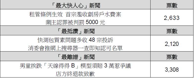 至於有小童不慎撞跌大公仔模型,商戶索償3萬元事件,以3315高票獲選為第2位,更同時獲公眾投選為「最離譜」消費新聞。消委會表示,投票結果反映,由抗疫至復常,消費者關注的新聞夾雜了疫情和其他多元化的議題。