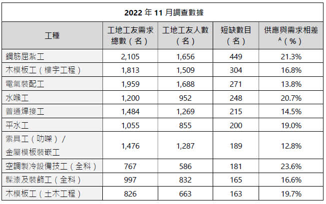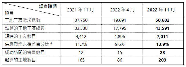 本次調查於去年11月24日進行,透過收集建造商會會員提供工地工友的出勤紀錄,推算當天整體勞工需求。資料顯示,調查當日有43591名工友出勤,欠缺的工人人數達7011人,與需求相差13.9%。