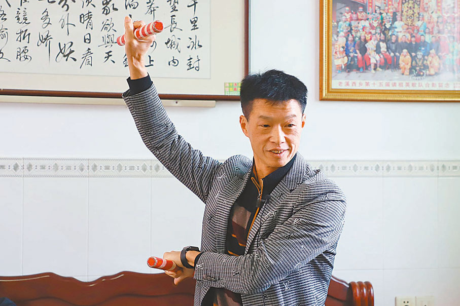 每逢農曆新年和民俗節慶,潮汕地區「跳英歌」便迎來高峰。英歌舞表演時長不一,有的大型節慶活動會持續整個白天。這對演員的體力、基本功和團隊配合程度提出了很高要求。潮汕英歌隊多屬民間業餘團體,隊員們只能白天上班、晚上練習。「光基本動作『舞槌』就不容易練好。」陳宋琪說,夏天晚上排練結束之後,地上的沙子都被汗水浸濕,濕沙甚至能勾勒出排練的隊形。
