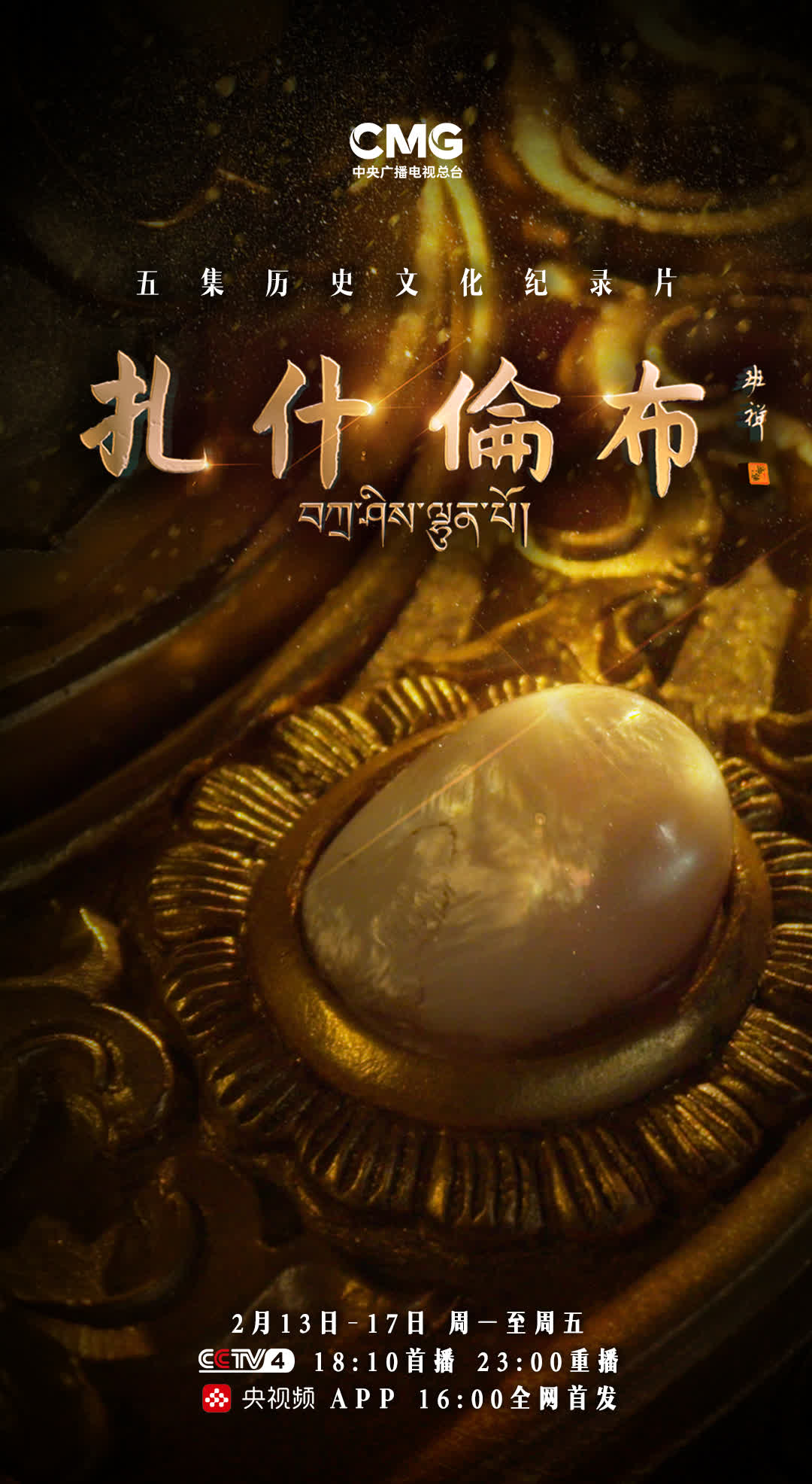 由中央廣播電視總台華語環球節目中心製作的五集歷史文化紀錄片《扎什倫布》,將於2月13日至2月17日每天18:10在央視中文國際頻道(CCTV-4)首播、23:00重播,央視頻16:00全網首發。