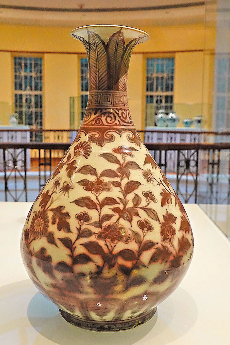 釉裏紅在那時為朝廷御製器皿,民間不得使用。明朝延續了紅色的使用,甚至成為皇室主流用色,製作了更多釉裏紅器物,「因為明代皇帝姓朱,所以許多皇室器物都以紅色為主。」陳俊熙解釋。今次展出的軍持(梵語音譯,即水瓶)、玉壺春瓶,都產自明洪武年間。但採用釉裏紅燒製方式難度極大,窯溫稍有誤差便無法成功,展品中一件看起來是灰色的明洪武年間製大盤,其實也是以釉裏紅方式燒製,在技術沒有被掌握得很好時,因燒製時氧化程度不同,最後呈現出別有風味的灰色色調。