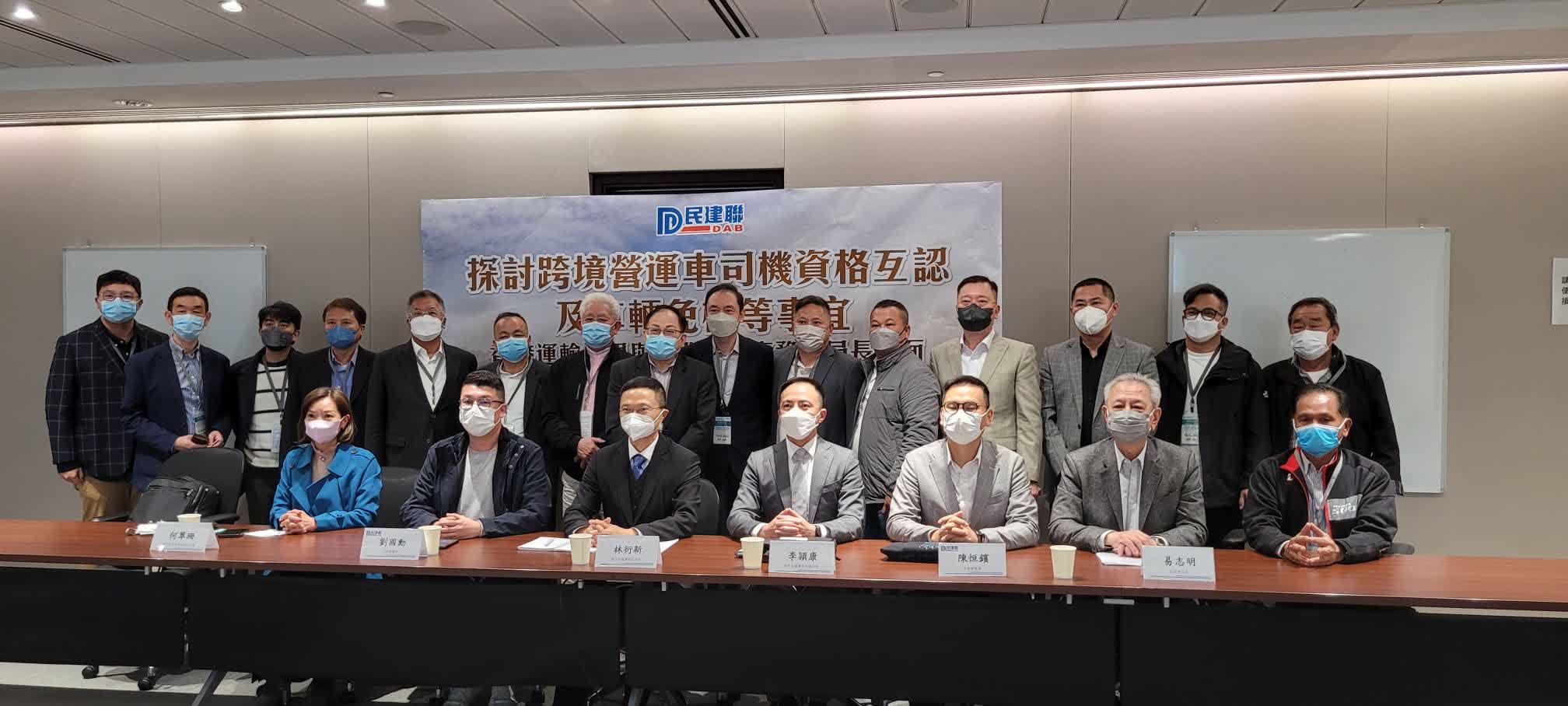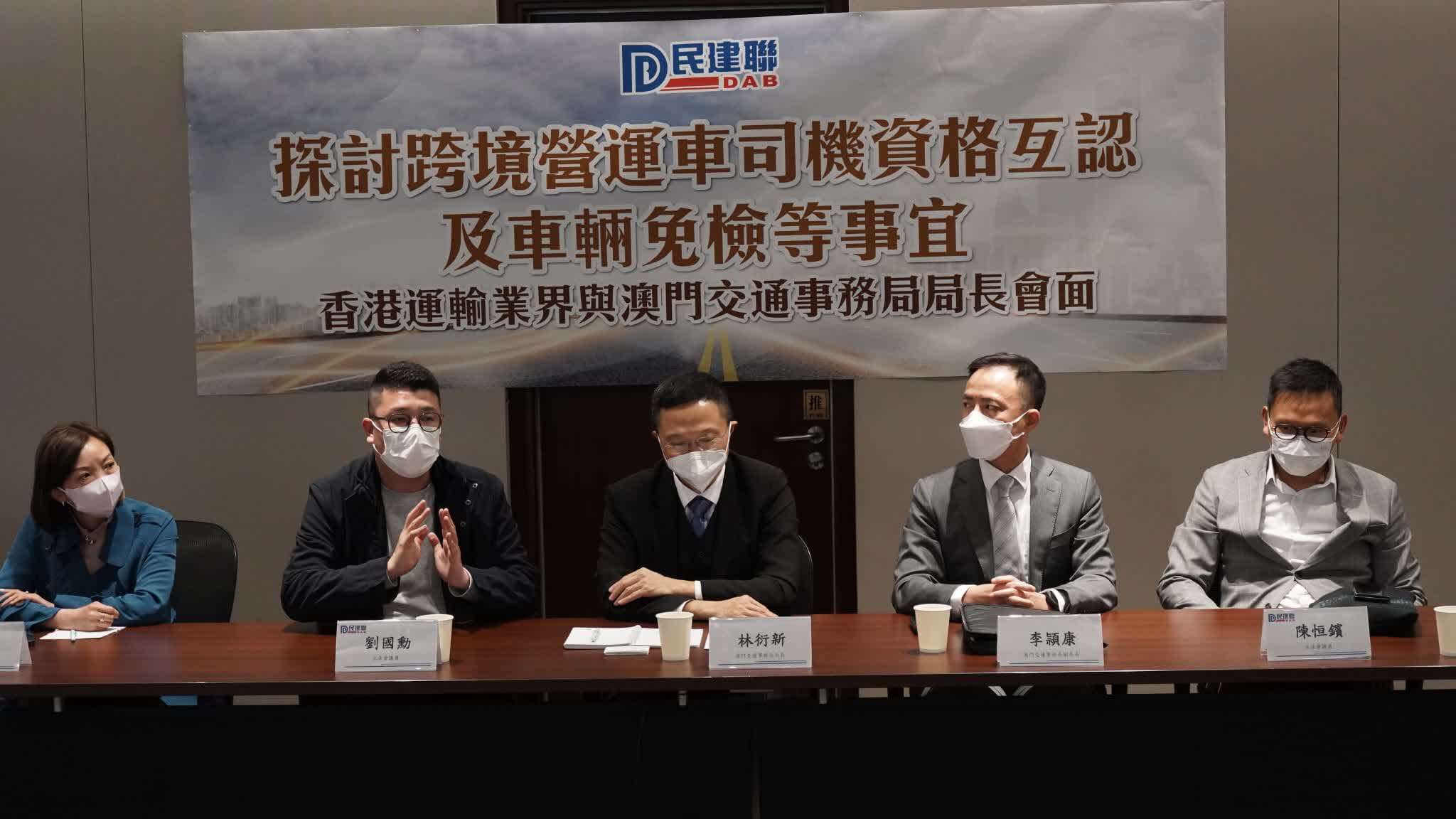 大公文匯全媒體報道:民建聯立法會議員劉國勳,陳恒鑌及自由黨航運及交通業界易志明,今日(14日)偕同20多名從事跨境客貨運輸業界與澳門交通運輸局局長林衍新、副局長李頴康,以及局長秘書兼港珠澳大橋三地聯合工作委員會辦公室澳方主任何翠珊會面,一同探討跨境營運車司機資格互認及車輛免檢事宜。