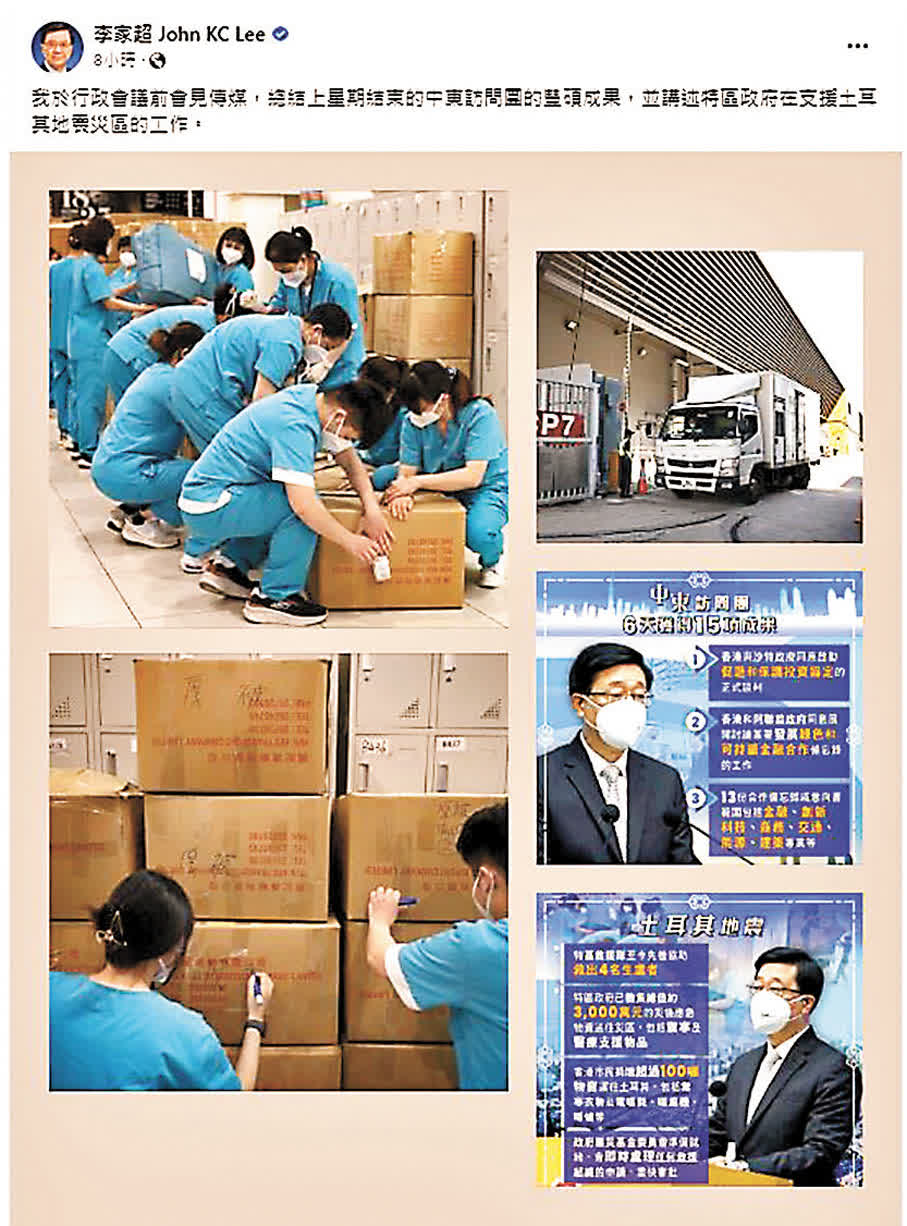 香港特區行政長官李家超關心香港參與土耳其地震救災及港人賑災情況。他昨日在社交平台發帖表示,在土耳其地震後,特區救援隊至今先後協助救出4名生還者,募集總值約3,000萬元的災後應急物資,以及市民捐贈超過100噸的物資,送往災區。同時,政府賑災基金委員會已準備就緒,會即時處理任何救援組織的申請,盡快審批。