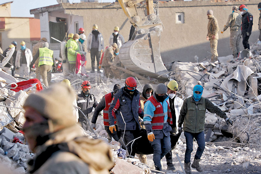 敘利亞多個省份受災嚴重,造成大量人員傷亡和財產損失。為及時救治因地震受傷的災民,很多醫護人員要強忍親人被掩埋在廢墟下失聯甚至遇難的悲痛,堅持在前線工作。50歲的哈利勒是一名麻醉師,從地震發生至今,他一直在醫院參與救治大量因地震受傷的病人。而就在數天前,救援人員才從廢墟下發現其妻子和兩名女兒的遺體。