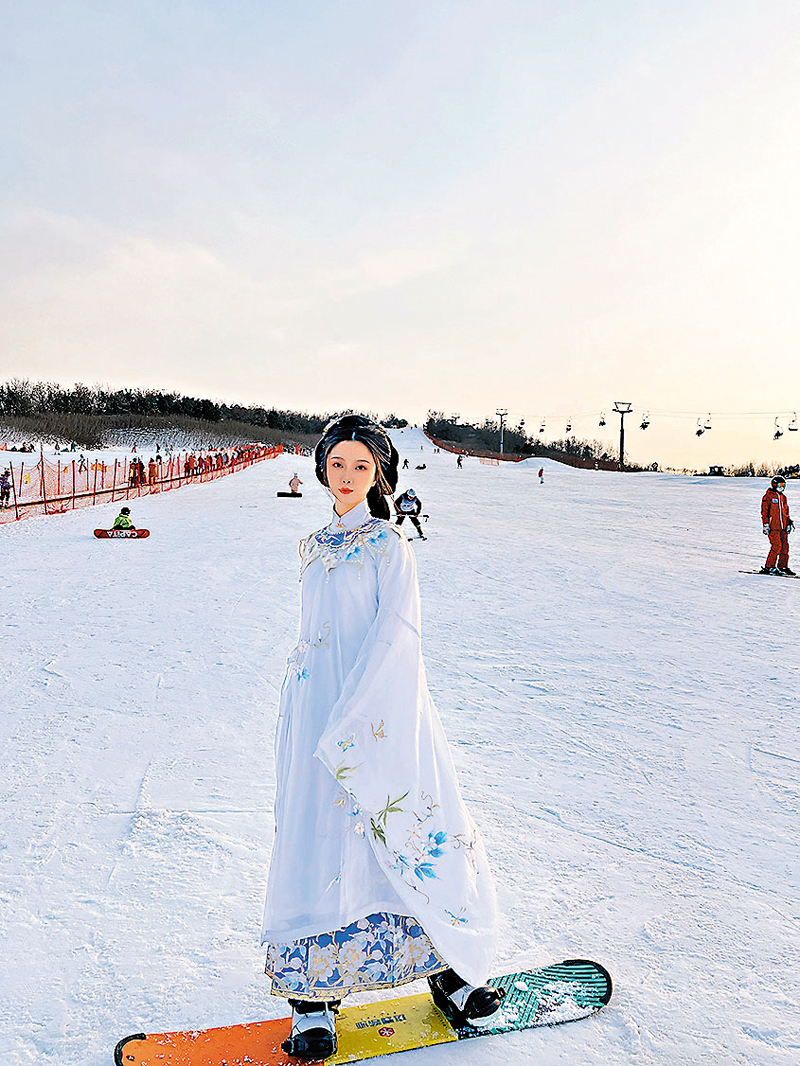 穿上漢服,踏上滑雪板,裙裾飛舞,古風漢服與滑雪場的結合賜予了青島融創藏馬山滑雪場(以下簡稱「藏馬山滑雪場」)不一樣的時尚和浪漫。「滑雪本身就是一種時尚,我們再賦予它更新更潮的元素。」融創文旅青島藏馬山項目總經理余愛軍告訴香港文匯報記者,滑雪群體多為年輕人和家庭客群,這個滑雪季他們不僅組織了漢服滑雪,還組織了獨立設計師的潮服滑雪。當潔白的雪道上,身着漢服和潮服的滑雪愛好者踏雪而來,着實是一幅美麗的畫面。