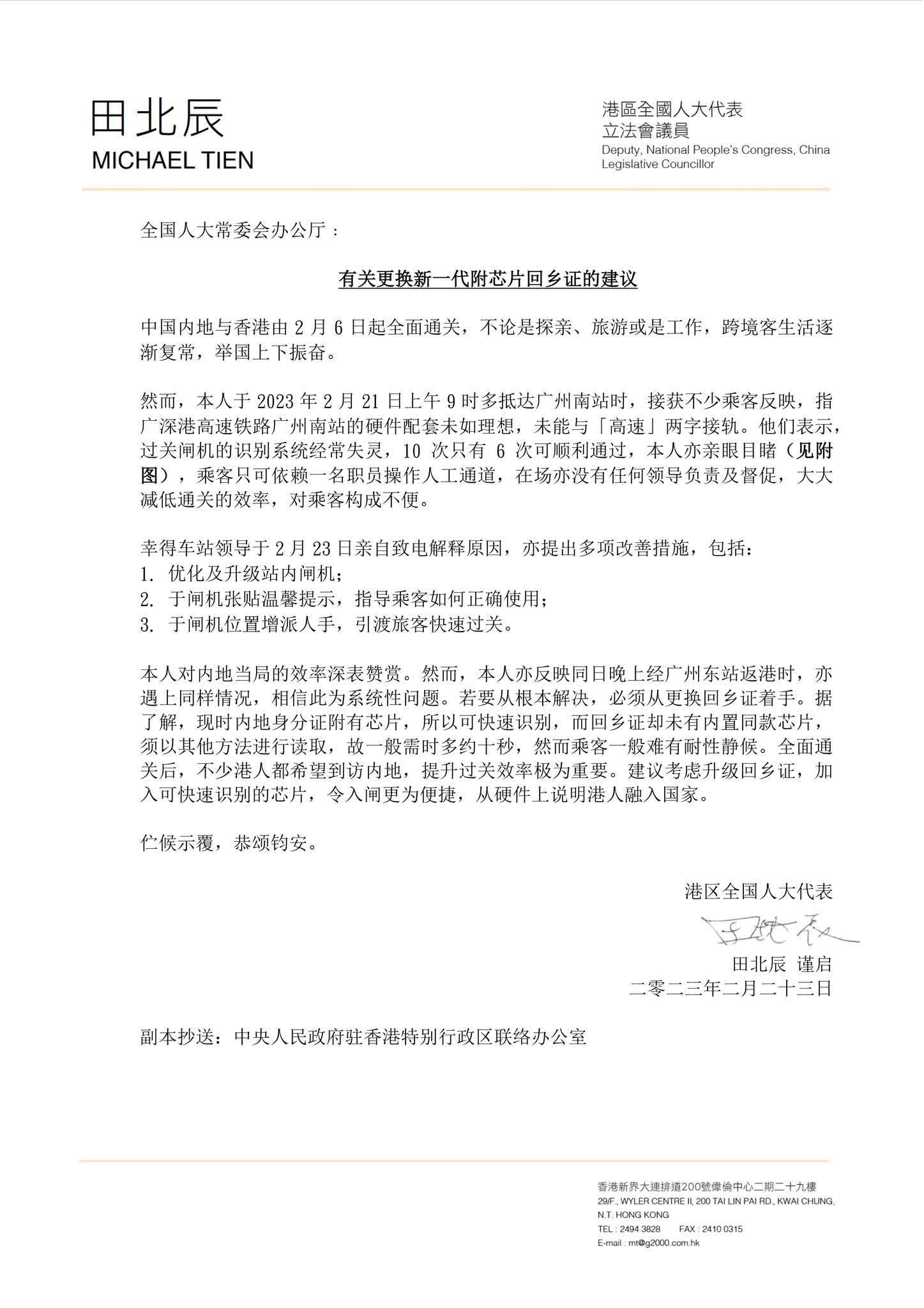 大公文匯全媒體報道:本港與內地實現全面通關,惟高鐵廣州南站硬件配套常出問題,乘客用回鄉證出閘無法識別,實政圓桌立法會議員田北辰早前去信全國人大常委會辦公廳要求全面升級。田北辰表示,今日(23日)收到車站方面致電,表示已做三項調整,包括將站內閘機進行優化同升級;在出閘機上張貼溫馨提示,教乘客如何正確使用;在出閘機加派人手,助旅客快速過關。