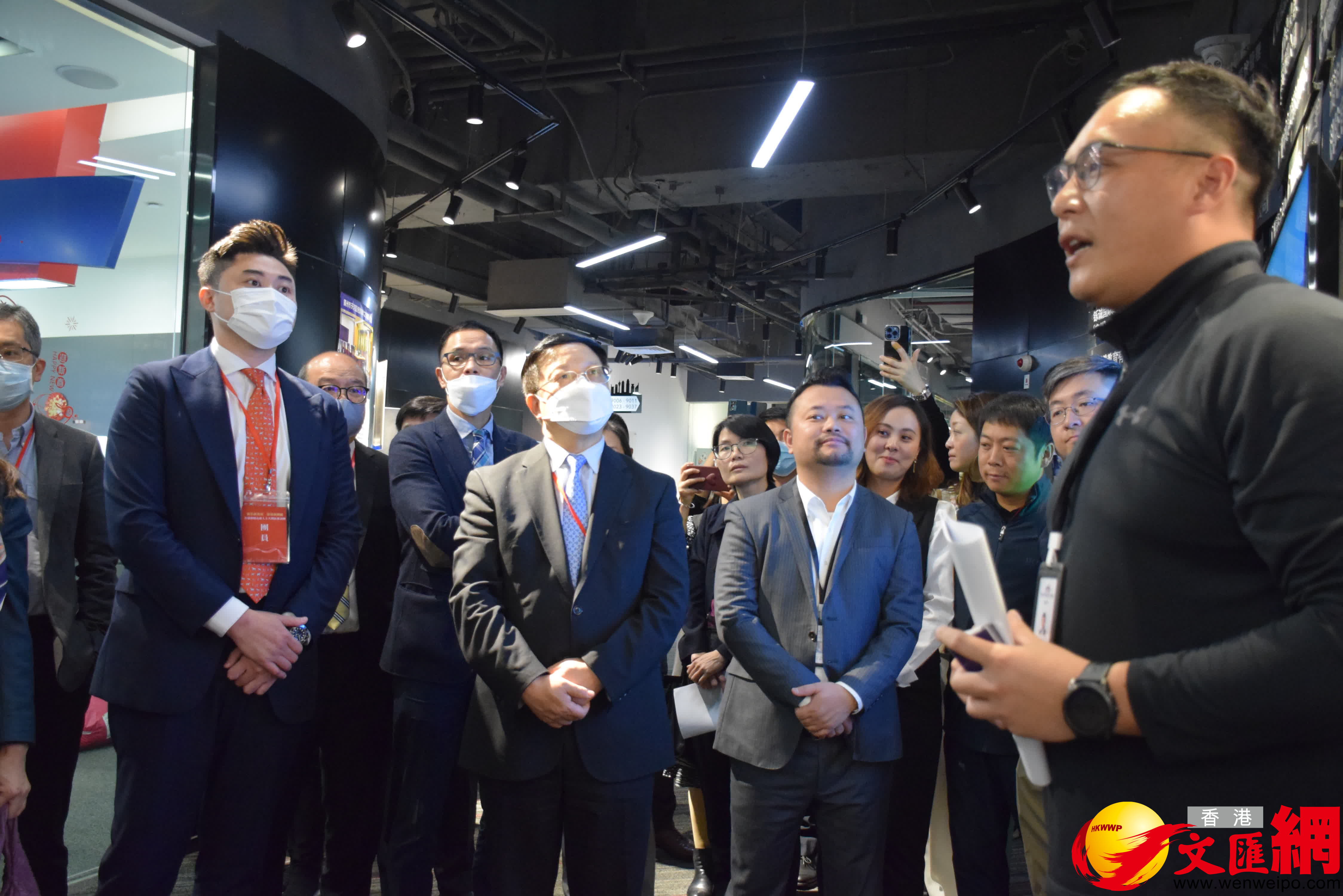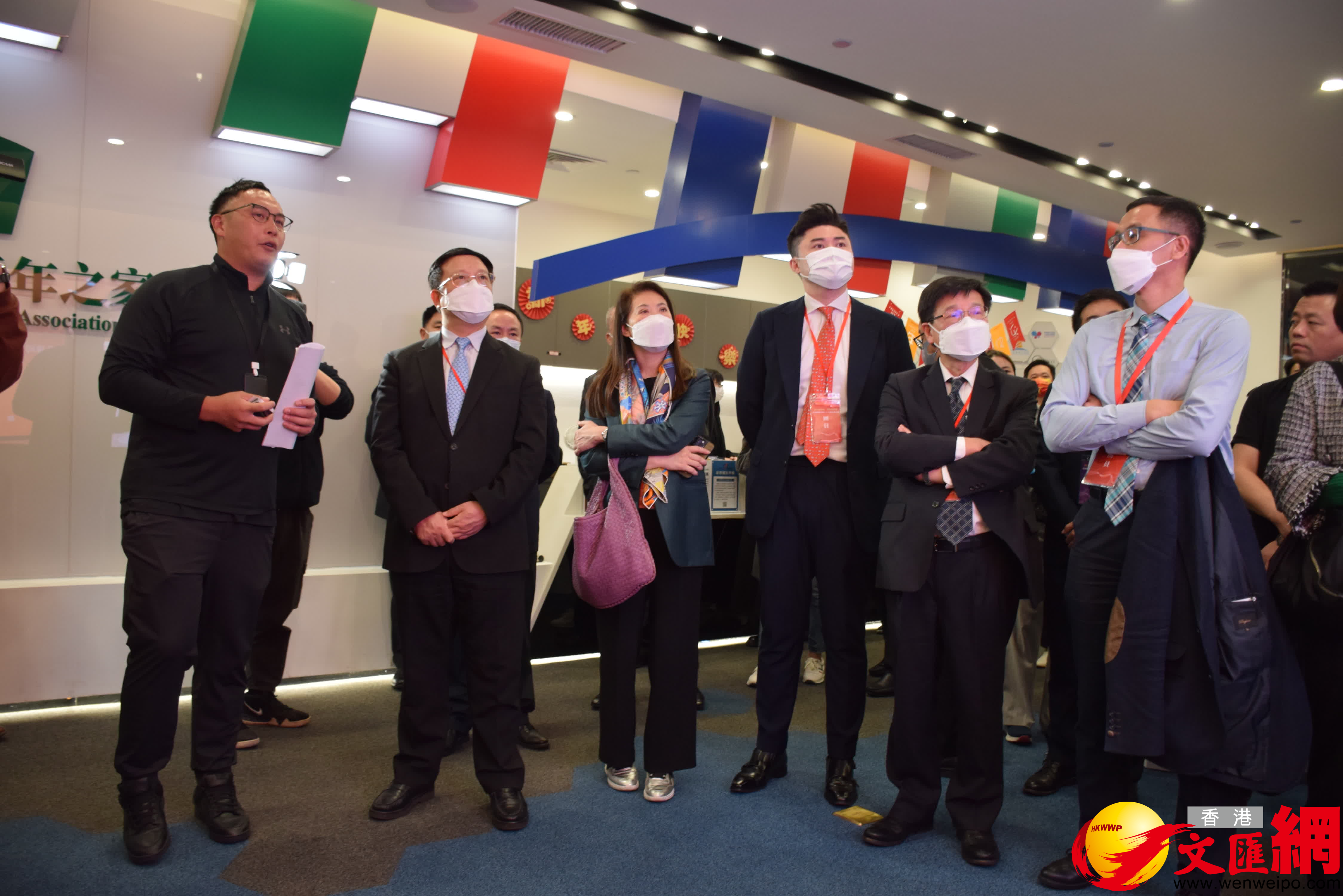 天河區港澳青年之家總部創業基地總經理陳賢翰帶領參訪團參觀了港澳創業明星企業牆。據介紹,天河區港澳青年之家提供創新創業、實習就業、學習交流、安居樂業四大版塊服務,助力港澳青年融入灣區發展。截至2022年底,總部入駐企業合計115家,其中港澳企業為100家,佔比86.9%,入駐項目以互聯網科技、商務服務、文化創意等類型為主。