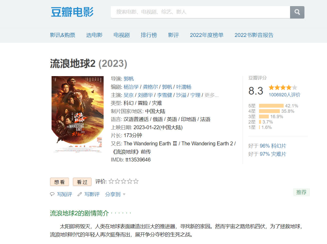 在影評網站豆瓣網上,《流浪地球2》的豆瓣評分為8.3分,評分人數更是罕見的突破100萬人。