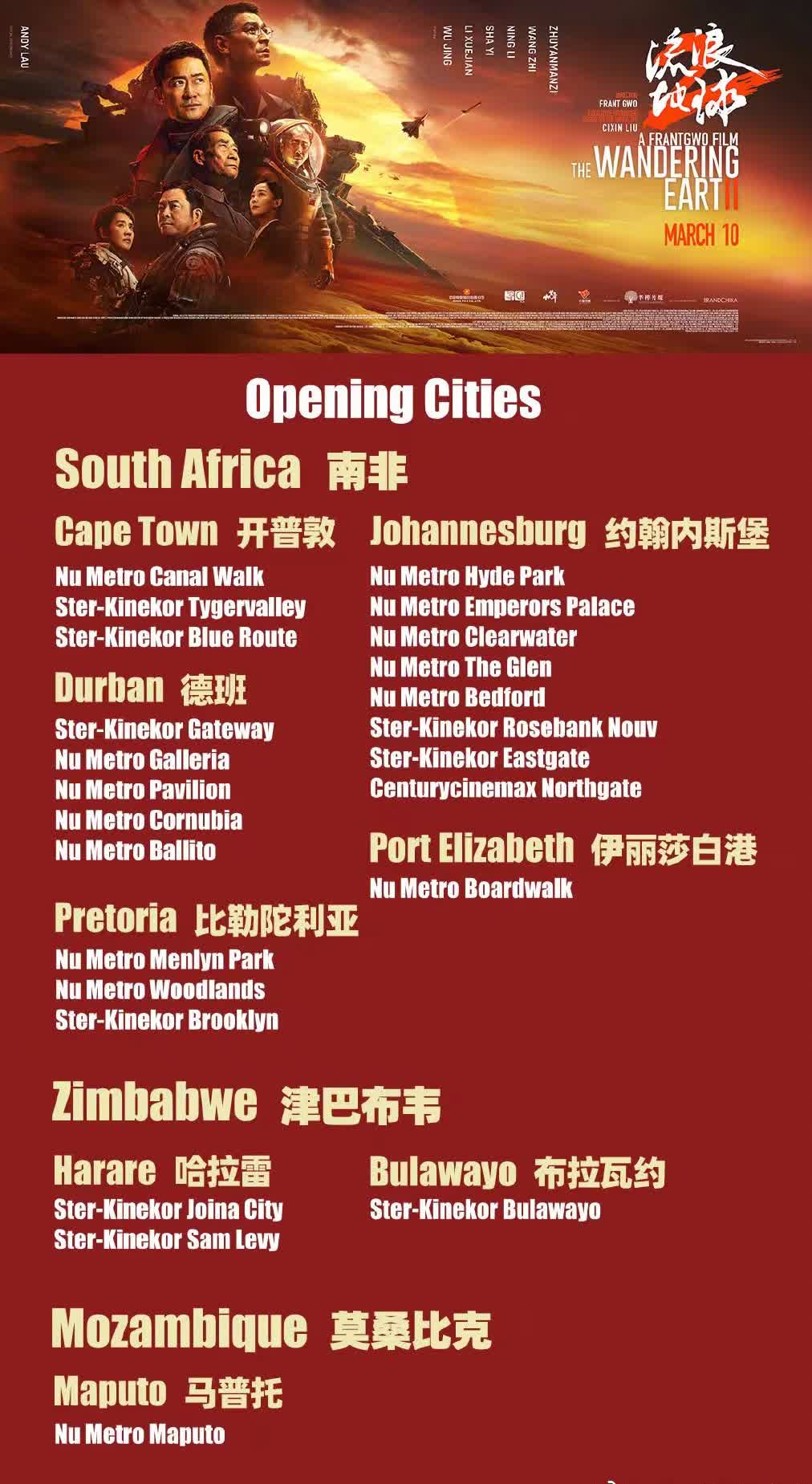 (香港文匯網記者 郭瀚林)國產科幻大片《流浪地球2》於今年春節檔在內地上映,獲得了極佳的票房成績和口碑。即在北美、澳新等地上映後,據官方微博消息,《流浪地球2》將於2023年3月10日登陸南非、津巴布韋和莫桑比克大熒幕,並於3月17日在贊比亞上映。
