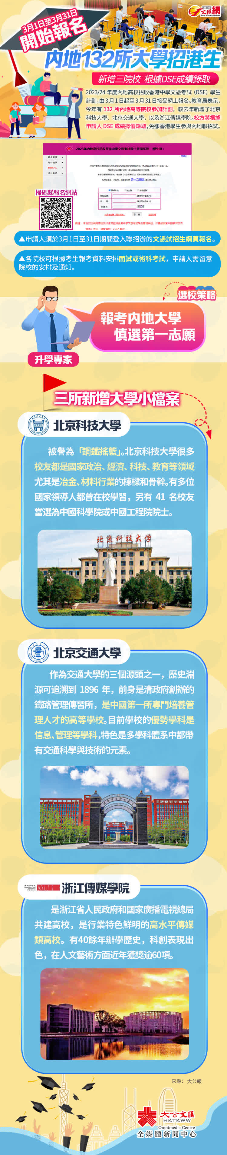 大公文匯全媒體報道:2023/24年度內地高校招收香港中學文憑考試(DSE)學生計劃,由3月1日起至3月31日接受網上報名。教育局昨日表示,今年有132所內地高等院校參加計劃,將依據DSE成績擇優錄取港生,較去年新增了北京科技大學、北京交通大學,以及浙江傳媒學院。港生如報考內地高校,有哪些注意事項?新增的三所高校都有哪些特色或優勢學科?快來一圖睇清!