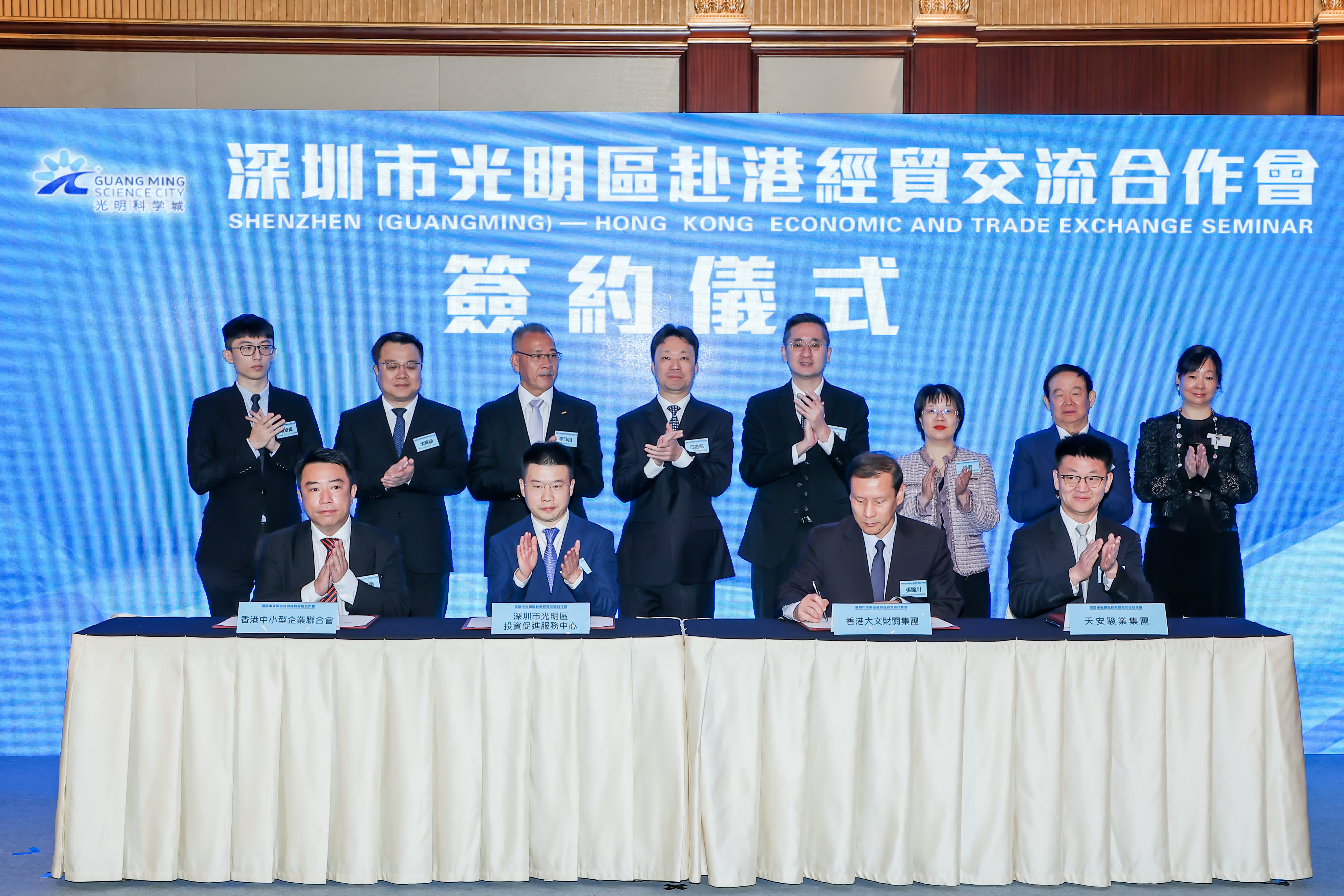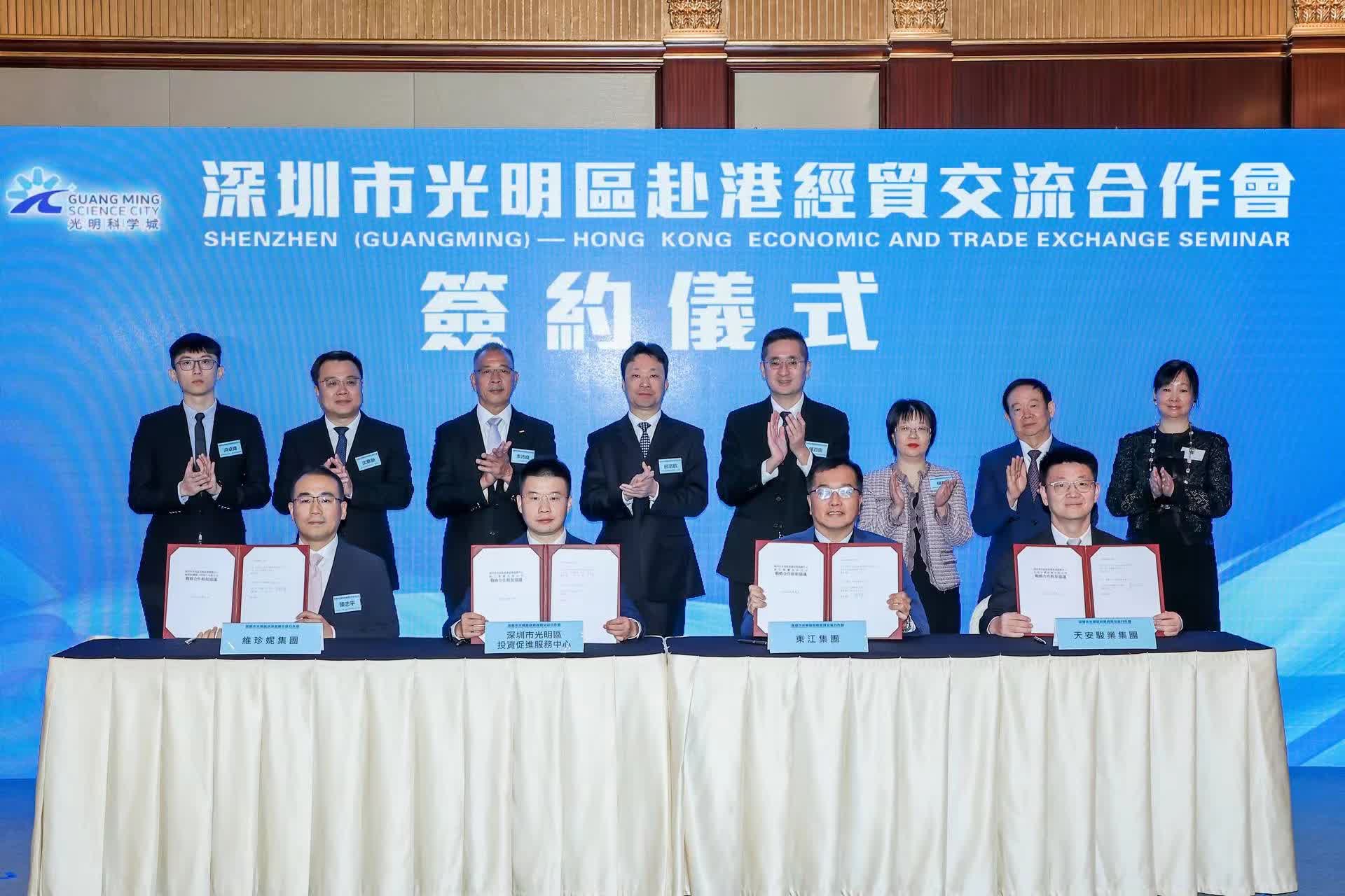 會上,深圳市光明區委副書記、區長邱浩航和香港特別行政區政制及內地事務局局長曾國衞分别致辭,深圳市光明區委常委、副區長沈華新介紹了光明科學城的建設。在簽約儀式環節,深圳市光明區投資促進服務中心分別與香港大公文匯傳媒集團、香港中小型企業聯合會、天安駿業投資發展集團簽署戰略合作協議,並與東江集團、維珍妮國際(控股)有限公司、天安駿業投資發展集團簽署投資意向協議。