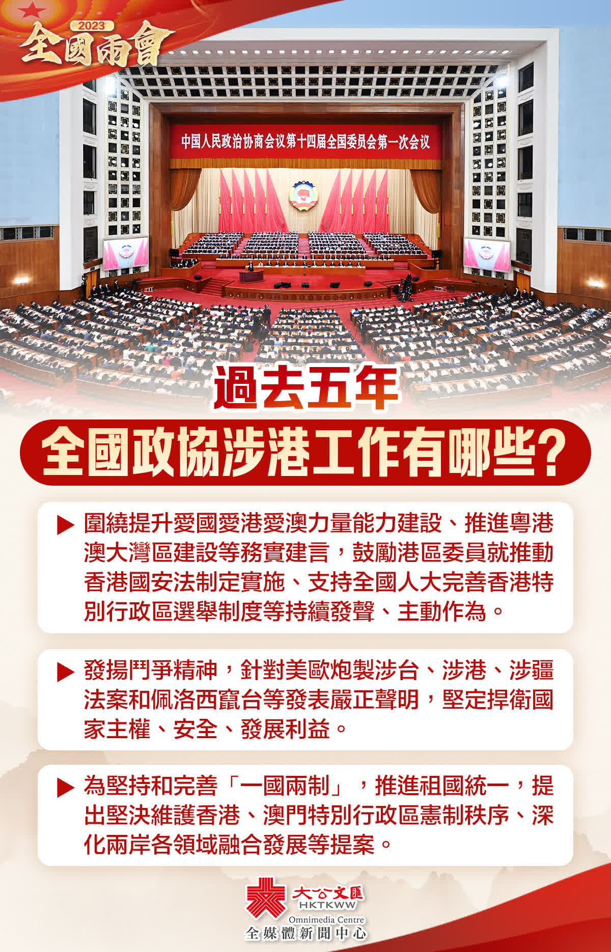 十三屆全國政協主席汪洋代表政協第十三屆全國委員會常務委員會作工作報告。回顧過去五年工作,汪洋表示,全國政協圍繞提升愛國愛港愛澳力量能力建設、推進粵港澳大灣區建設等務實建言,鼓勵港區委員就推動香港國安法制定實施、支持全國人大完善香港特別行政區選舉制度等持續發聲、主動作為。另外,全國政協發揚鬥爭精神,針對美歐炮製涉台、涉港、涉疆法案和佩洛西竄台等發表嚴正聲明,堅定捍衛國家主權、安全、發展利益。