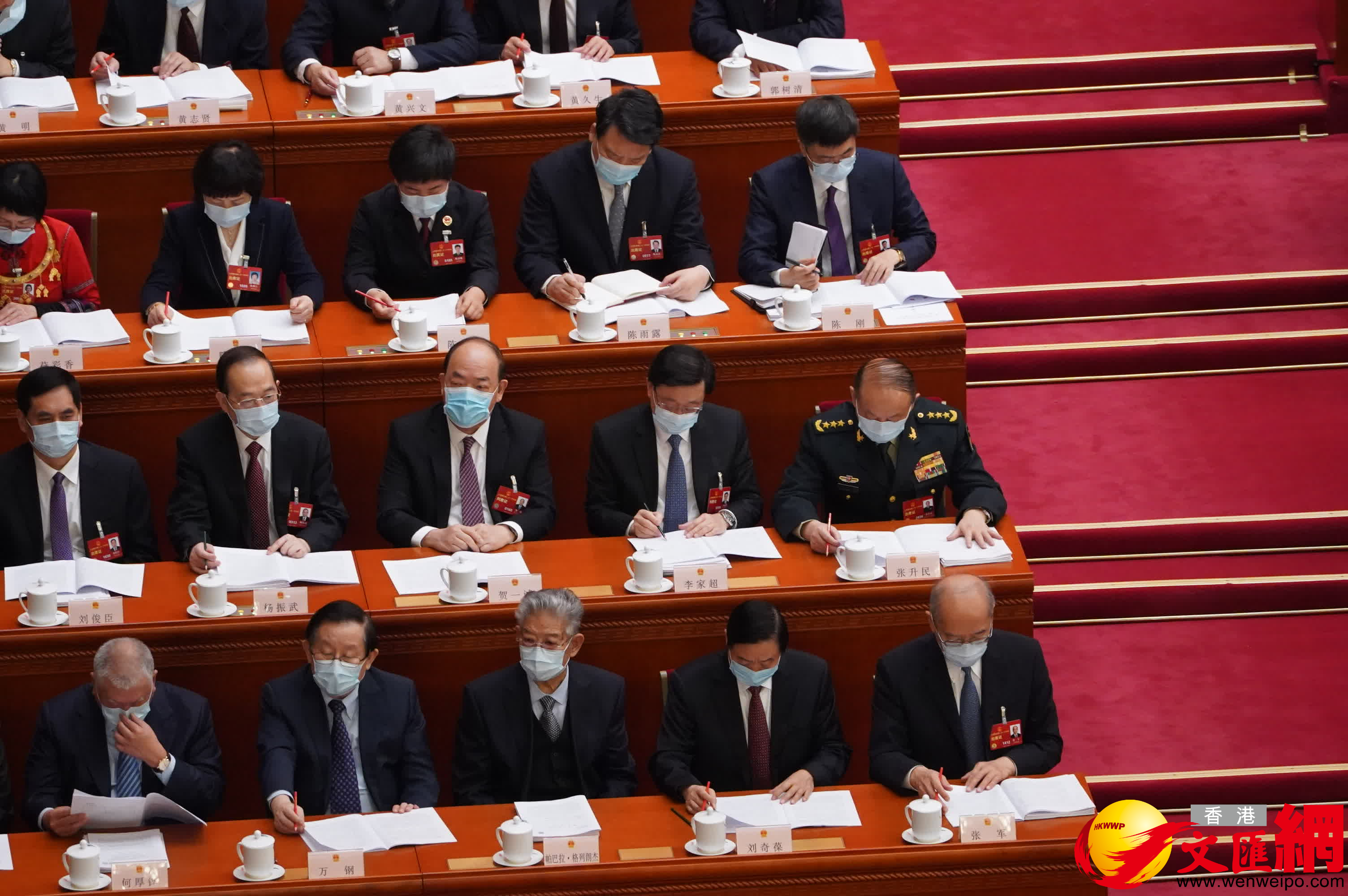 大公文匯全媒體報道:十四屆全國人大一次會議開幕會今日(5日)上午9時在北京人民大會堂舉行。香港特別行政區行政長官李家超首次列席會議。大會開始前,李家超與澳門特別行政區行政長官賀一誠交談,又與旁邊的中共中央軍委委員張升民交流。在聽取國務院總理李克強作關於政府工作的報告時,李家超低頭不時做筆記,態度認真。