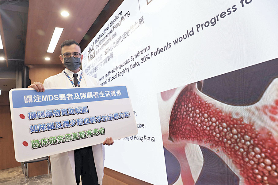 香港文匯報訊(記者 唐文)骨髓增生異常綜合症(MDS)是相對罕見的癌症,現時全港約有2,500名患者,確診時年齡中位數高達70歲,大部分患者無法移植骨髓,終生需要輸血。香港大學醫學院近年整合全港首個MDS患者資料庫,提高公眾對該病認知,並希望政府增加MDS患者的獲資助藥物種類,以減輕他們的經濟負擔。