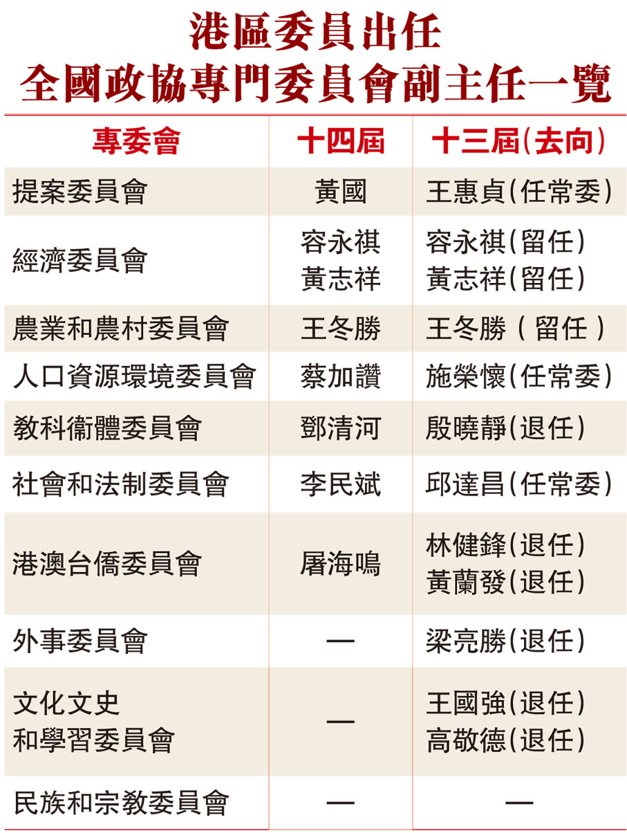 在十三屆全國政協十個專委會擔任副主任的香港委員中,原提案委員會副主任王惠貞、人口資源環境委員會副主任施榮懷、社會和法制委員會副主任邱達昌共3人,升任第十四屆全國政協常委,不再擔任專委會副主任一職。