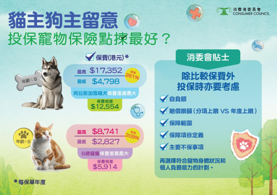 消委會提醒,投保人與寵物就醫前先應確認前往的診所是否屬名單內,同時亦應理解清楚不同計劃自負額的計算方法,有需要時聯絡保險公司查詢,以免於索償時才發現自己需要承擔的金額比預期多而失去預算。