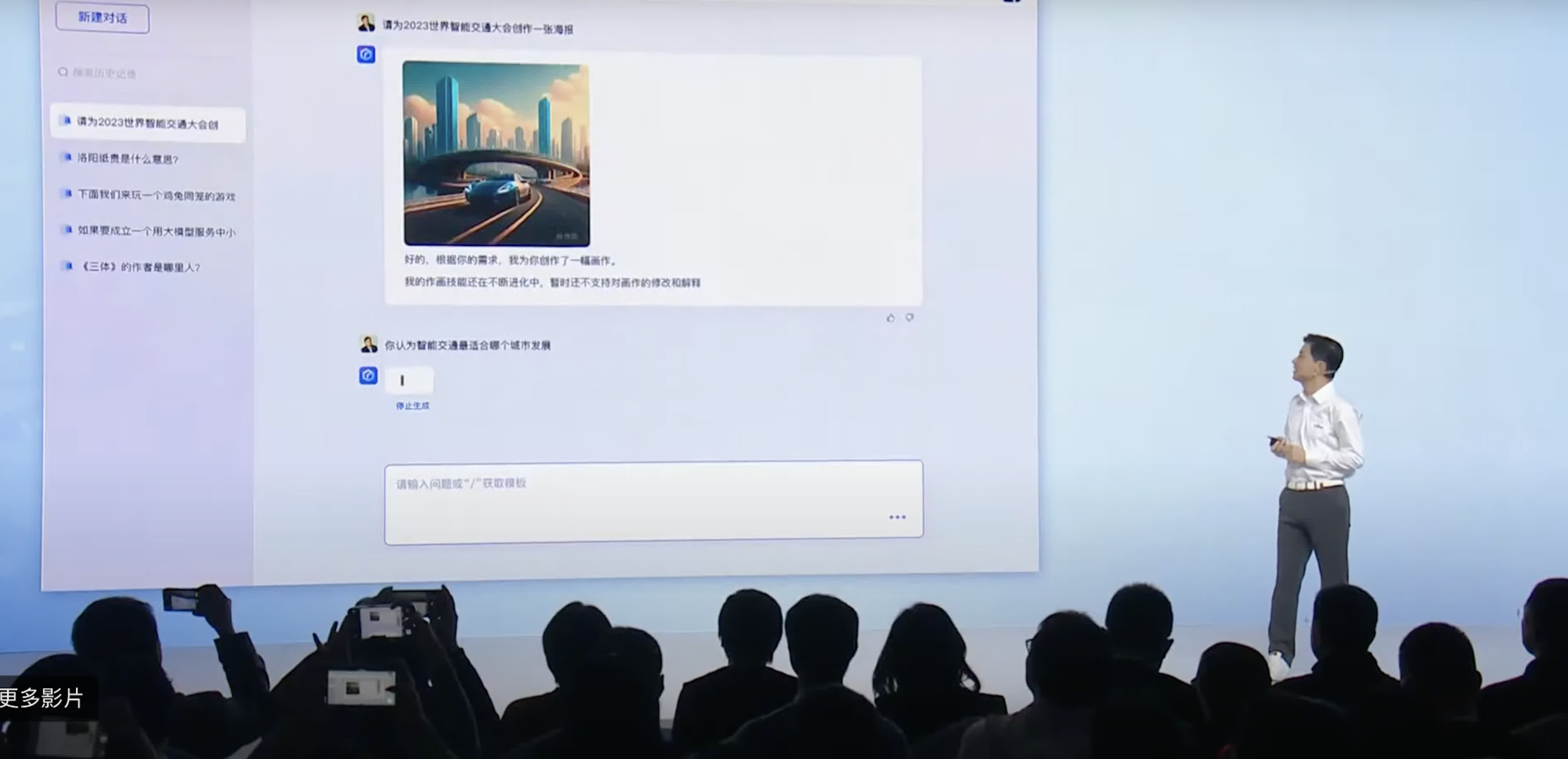 除了寫的能力,「文心一言」更擁有與「Midjourney」相似的繪畫能力,更按李彥宏要求設計出了一幅世界智能交通大會的海報。此外,發布會的海報原來也是由「文心一言」製作。另外,「文心一言」能還按要求為世界智能交通大會的文案內容配上視頻和字幕。