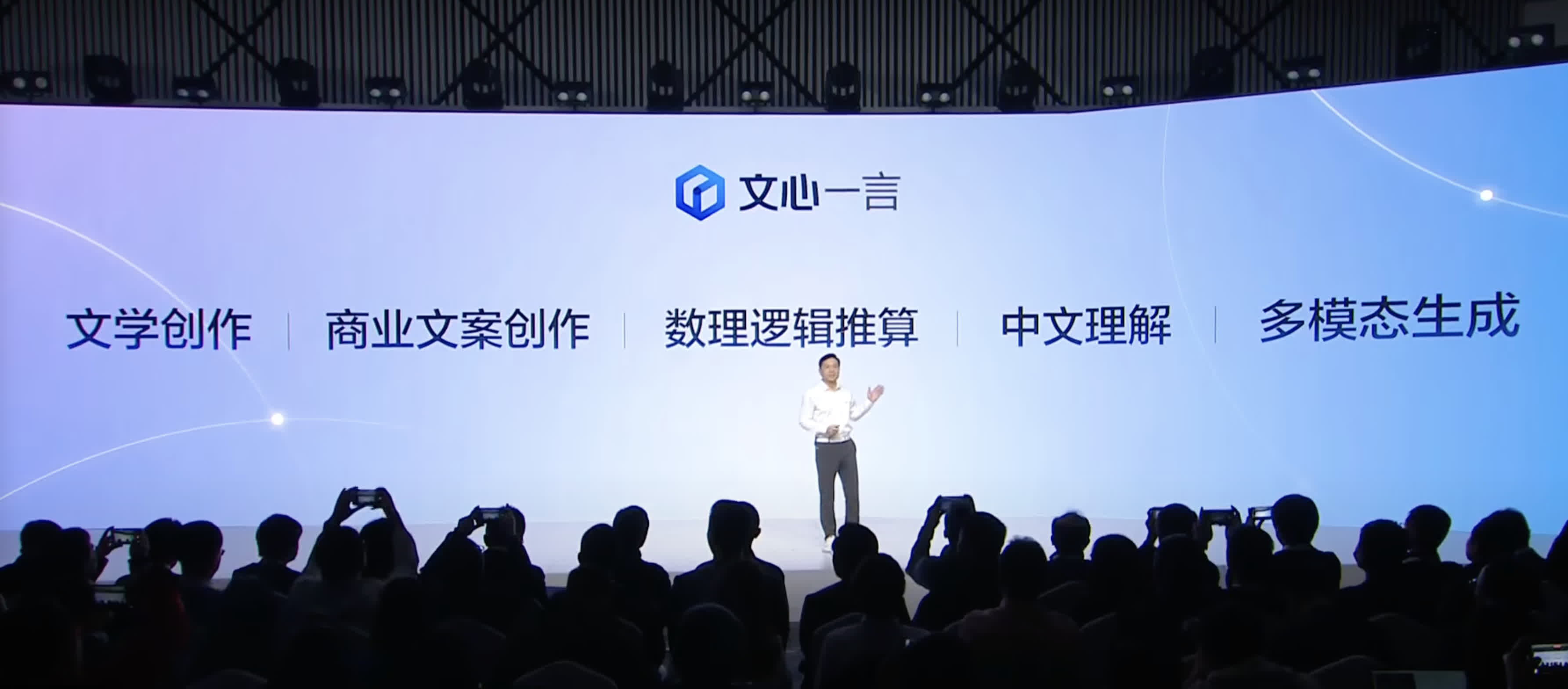 發布會於下午2時準時開始,分為李彥宏的產品演示和技術官王海峰的技術講解兩部分。李彥宏一開始就表示,「文心一言」的技術尚不完美,但基於企業客戶的期待和殷切需求,仍然盡早開放測試,並在過程中將不斷迭代、進化;「文心一言」的中文暫時比英文要強得多,因為模型都是較多使用中文訓練。李彥宏在發布會上分別演示了「文心一言」的五個使用場景,分別是文學創作、商業文案創作、數理邏輯推算、中文理解和多模態生成。
