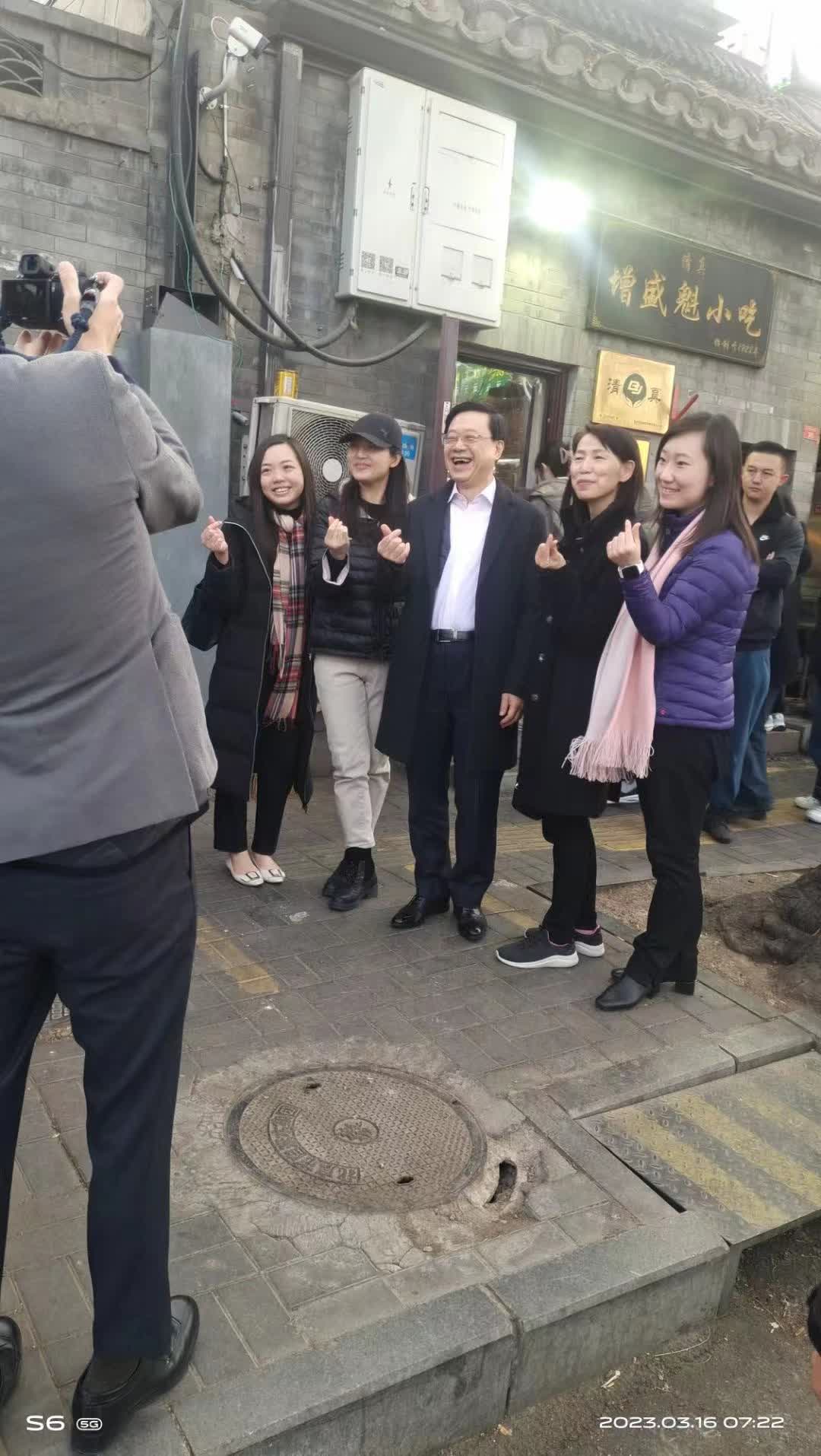 七點半左右特首一行離開時,上門吃早點的北京市民紛紛圍住特首紛紛要求合影,特首也欣然應允,大家一起在店門前為北京小吃點讚。