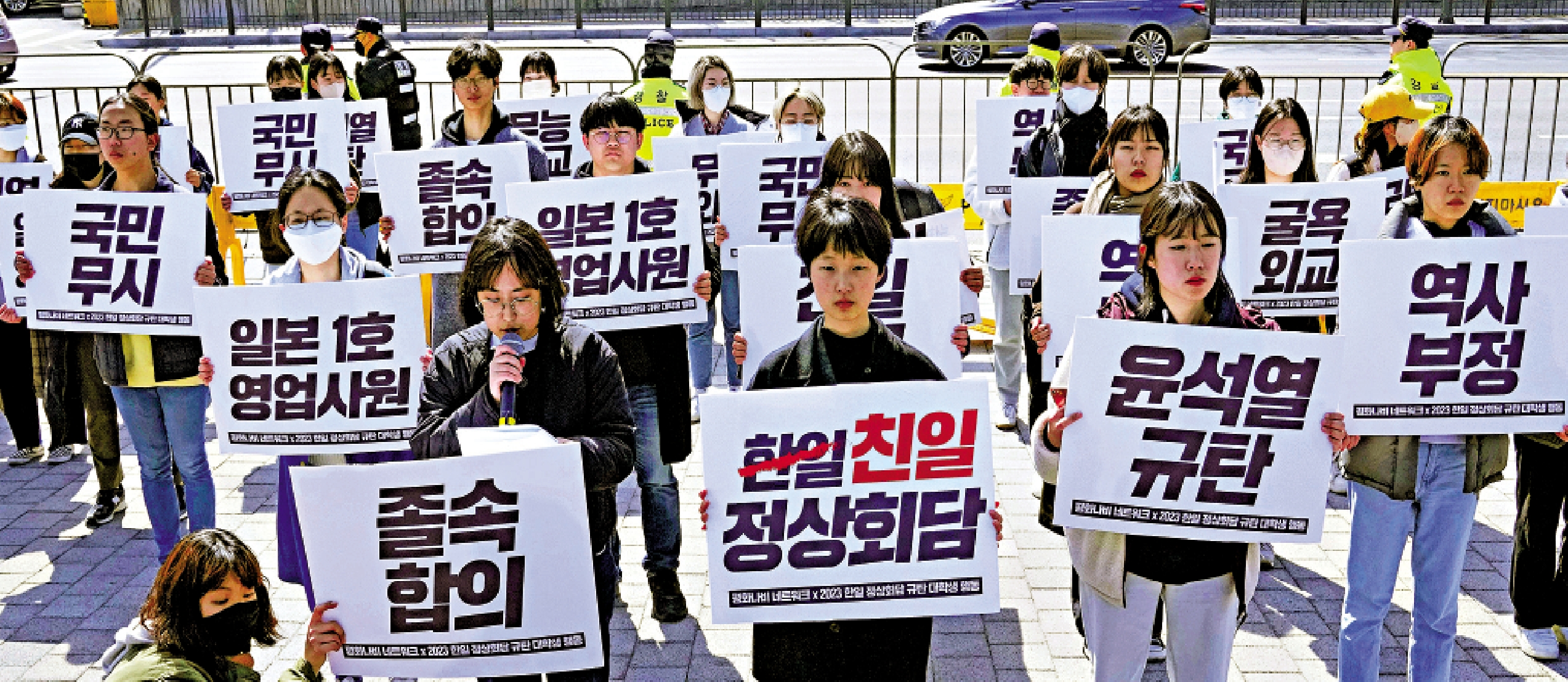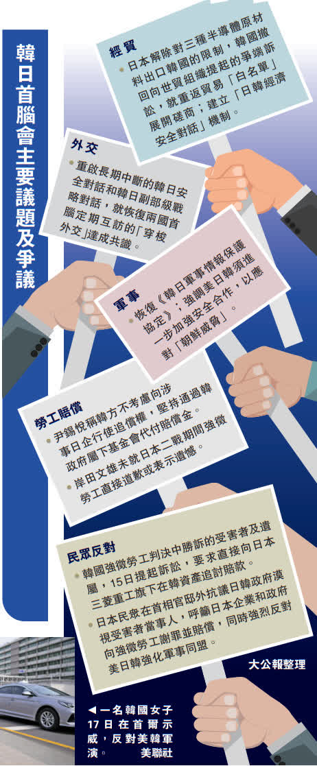 大公報綜合韓聯社、路透社、《韓民族日報》報道:韓國總統尹錫悅17日結束對日本為期兩天的工作訪問回國。在韓日領導人形容兩國關係「開啟新篇章」的同時,韓日國內都傳出反對聲音。韓國在野黨痛斥此次韓日首腦會是「外交史上最屈辱和最可怕的時刻」,抨擊尹錫悅政府選擇成為日本政府的「傀儡」,卑躬屈膝向日方求和;韓國民眾上街示威,稱「希望他(尹錫悅)不要從日本回來了」。不少日本民眾16日在首相官邸前抗議兩國無視歷史受害者,同時強烈反對美日韓強化軍事同盟。