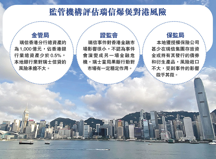 金管局及證監會昨日表示,瑞士信貸在香港的業務包括一家受金管局監管的瑞士信貸香港分行,以及兩家受證監會監管的持牌法團,所有公司都將照常營業。客戶可以繼續透過該分行存取存款及使用瑞士信貸提供的交易服務買賣香港股票和衍生產品。