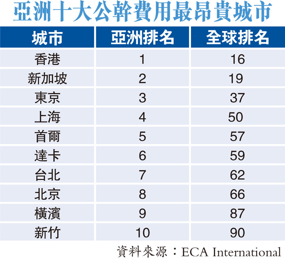 與新加坡一樣,台北及新竹等台灣城市排名也上升,均晉身十大亞洲公幹成本最高的城市之列。