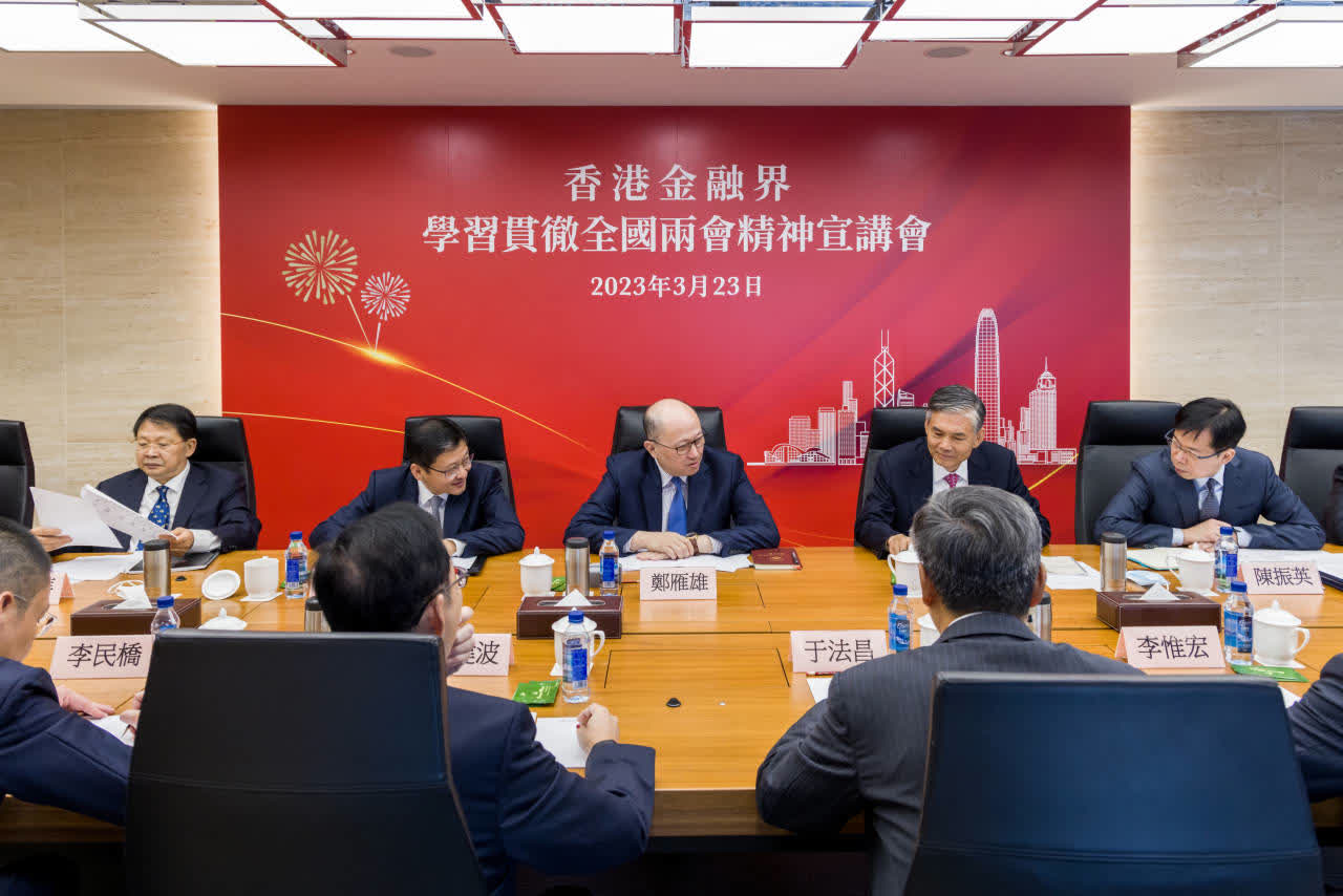3月23日,香港金融界、創科界分別舉行「學習貫徹全國兩會精神宣講會」。中央政府駐港聯絡辦主任鄭雁雄應邀出席並作交流分享。中國銀行(香港)總裁孫煜、京港學術交流中心總裁徐海山分別主持宣講會。中央政府駐港聯絡辦副主任尹宗華、秘書長王松苗,香港金融界、創科界代表人士和青年骨幹等60多人參加。