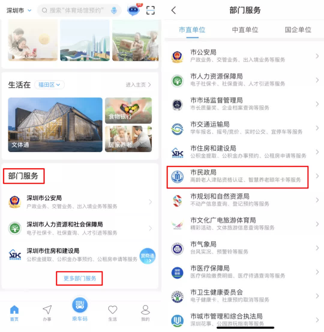 2.首頁往下滑,在「部門服務」板塊,點擊「更多部門服務」,選擇「市民政局」。