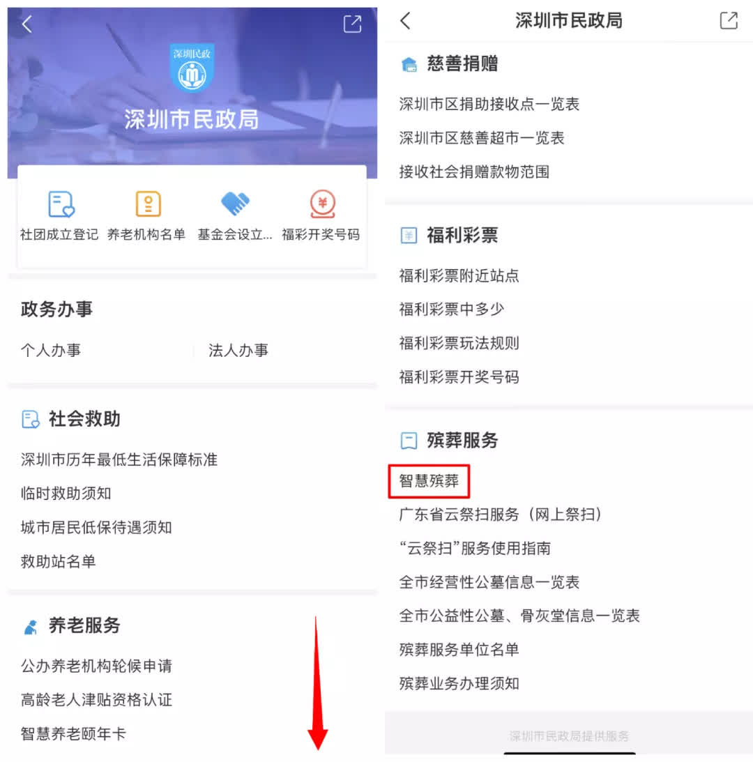 3.進入深圳市民政局服務專區後,下滑頁面至底部,在「殯葬服務」板塊,選擇「智慧殯葬」。