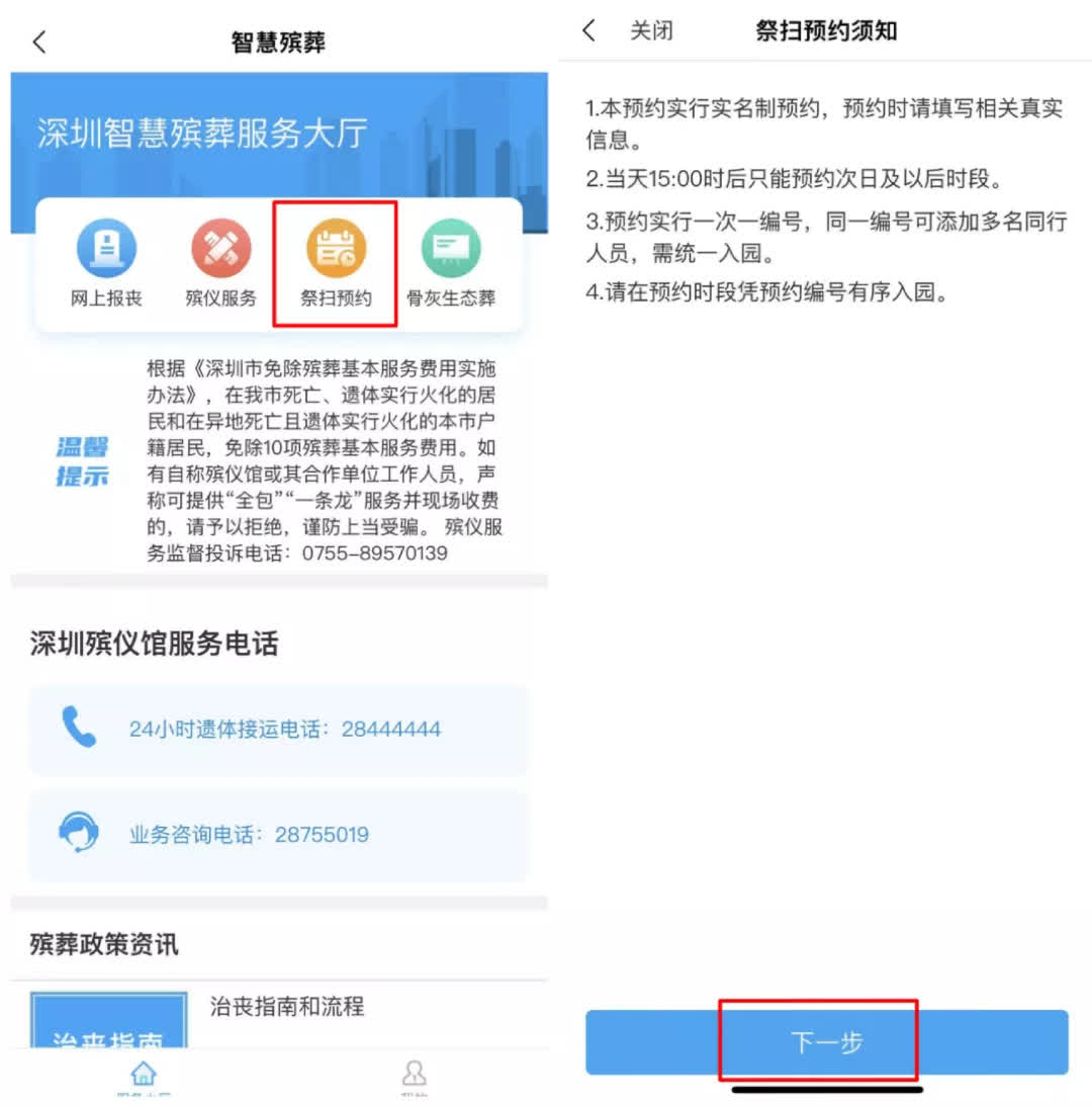 1.撥打電話0755-25036309或15914135133預約,登記預約姓名、身份證號、手機號、祭掃車輛數、祭掃人數、車牌號碼後,按預約時間前往祭掃。