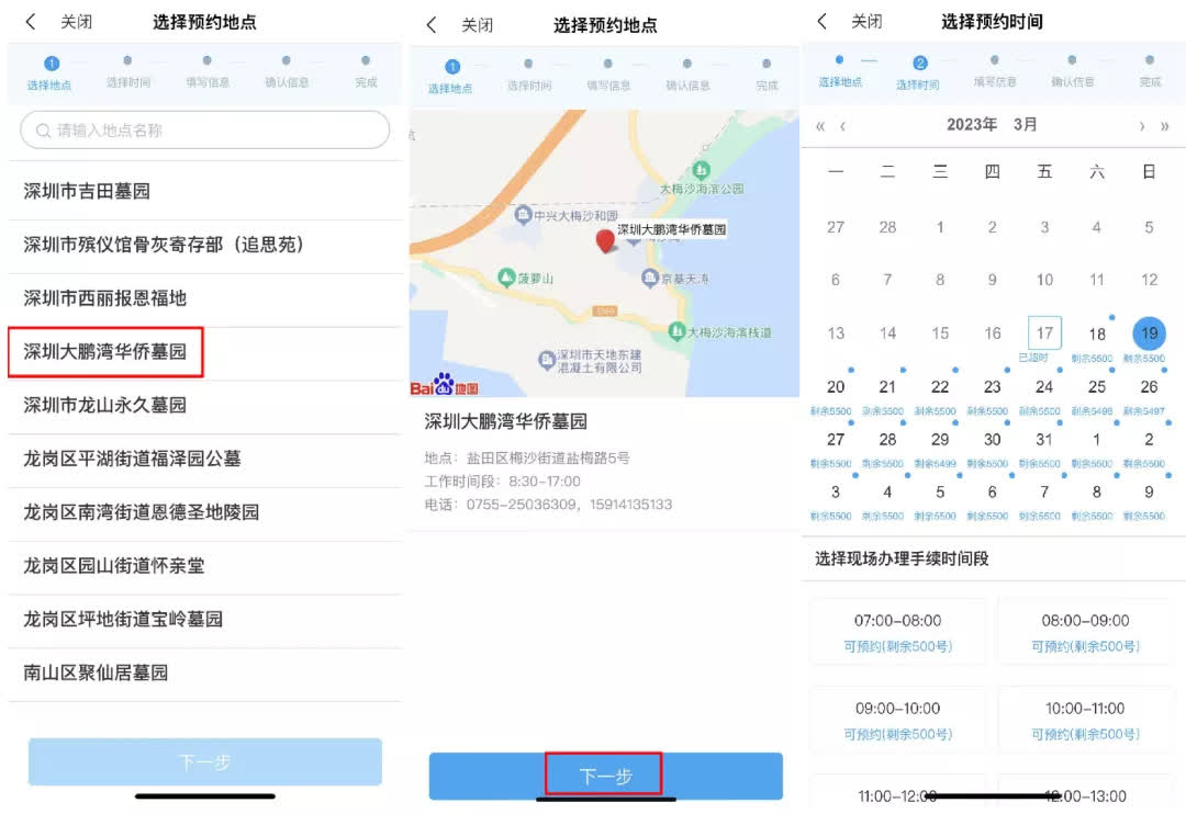5.選擇「深圳大鵬灣華僑墓園」,點擊「下一步」,選擇預約日期及時間段,填寫預約人信息,確認後提交即可。