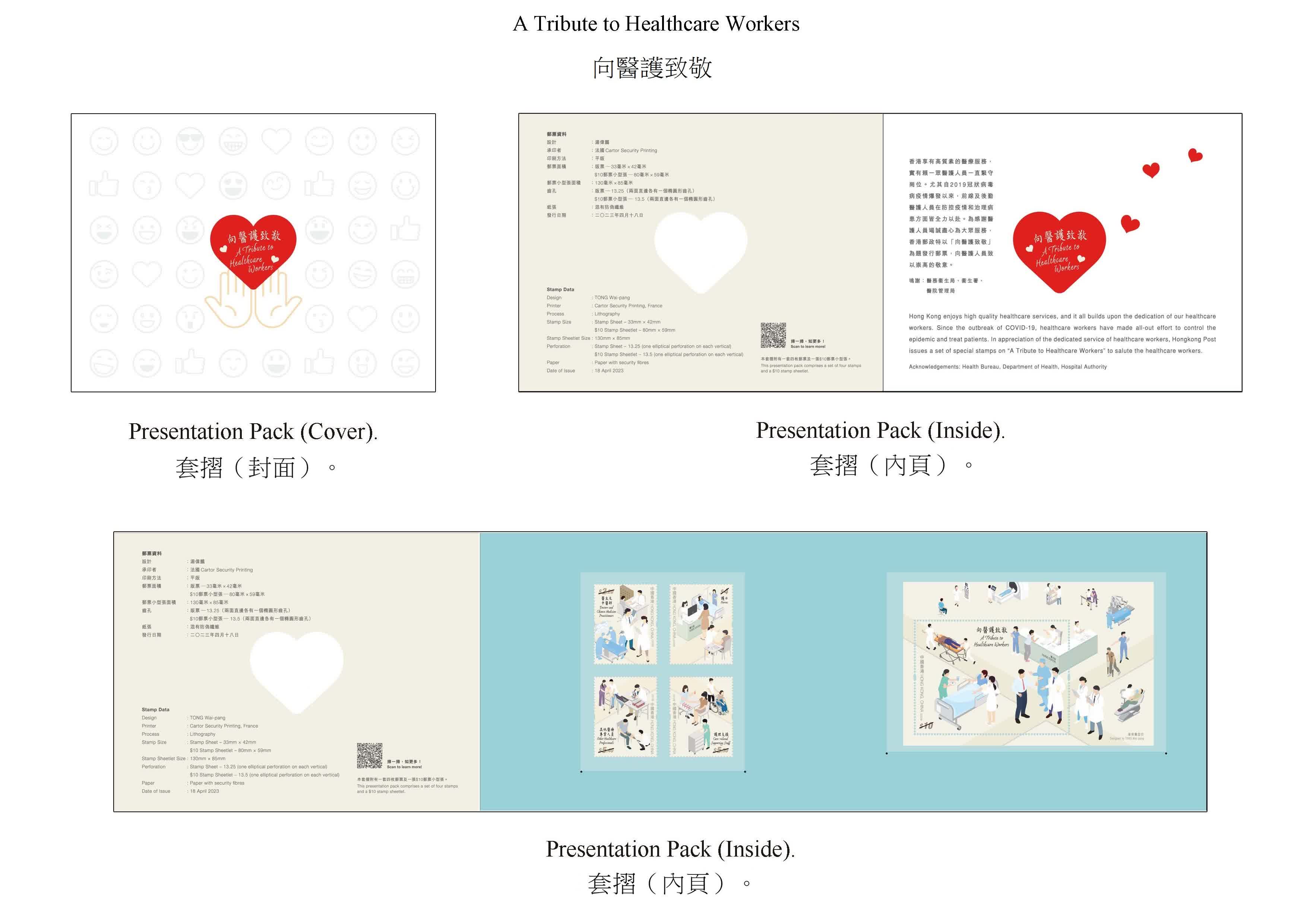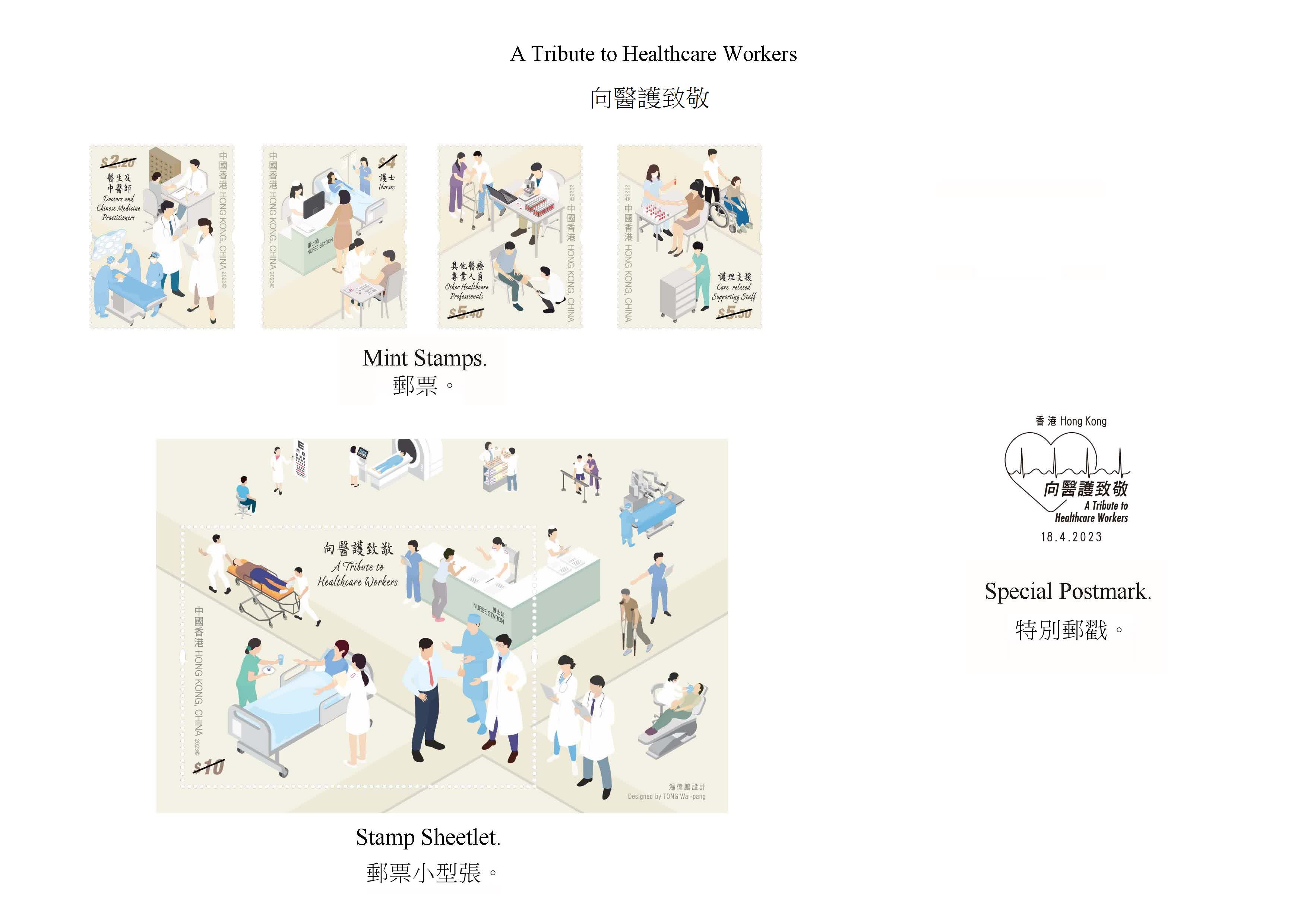 這次發行的郵品展示一眾與市民並肩作戰的醫護人員,包括醫生、中醫師、護士、其他醫療專業人員及護理支援人員,他們不辭勞苦地工作,盡心竭力為守護香港及保障市民的健康作出貢獻,充分彰顯醫護人員專業無私的精神。