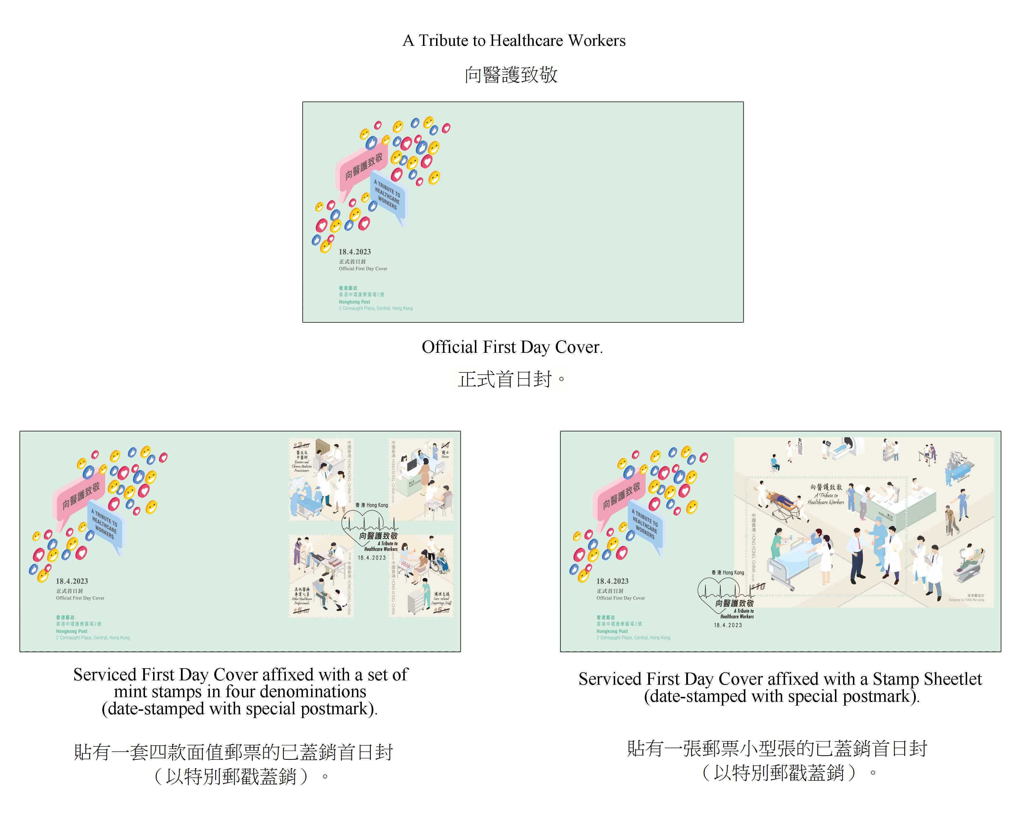 全線郵政局和網上購物坊「郵購網」明日(29日)起發售「向醫護致敬」正式首日封。這套特別郵票及相關郵品4月18日起在各郵政局及「郵購網」發售,而貼有特別郵票的已蓋銷首日封只限在集郵局發售。各郵政局4月18日為所有正式首日封/註明首日字樣和本地地址的自製封,提供即時人手蓋印服務。所有郵政局會於當日設置收集點以便顧客遞交需要人手蓋印服務的首日封/自製封。