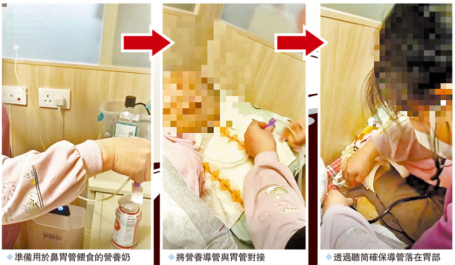 粗活事小,關乎人命的違規操作最教她們膽戰心驚。從未接受過護士或保健員專業培訓的雅姐表示,由於正規護士及保健員人手不足,院舍竟罔顧院友的安危,安排外勞執行「吊奶」工作。「我哋護理員係不合資格做呢個工作,但係其他外勞同事都係咁做,我都無辦法唔依從。」雅姐透露,相關「吊奶」工作,一開始由院舍的保健員簡單講解,包括使用聽診器聽院友腹部,確保導管已通入胃部,以免營養奶誤入肺部造成急性肺炎。