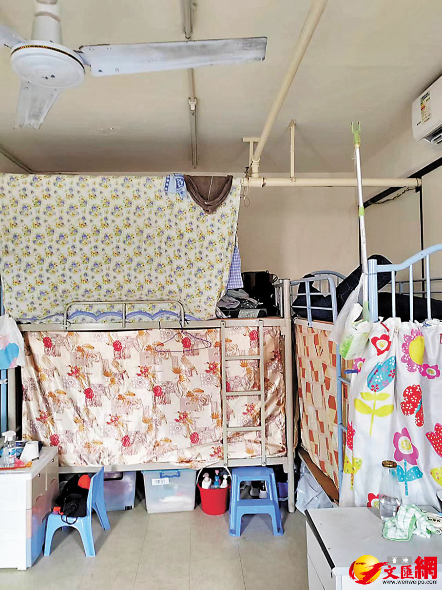雯姐工作的院舍位於公共屋邨一間商場內,院方租用商場天台一個圓形單位作員工宿舍,連雯姐在內8名外勞蝸居在約180平方呎空間裏,「入面只有4張鐵架床,幾個膠箱裝衣物及個人物品塞入床底,就是我們全部家當。」