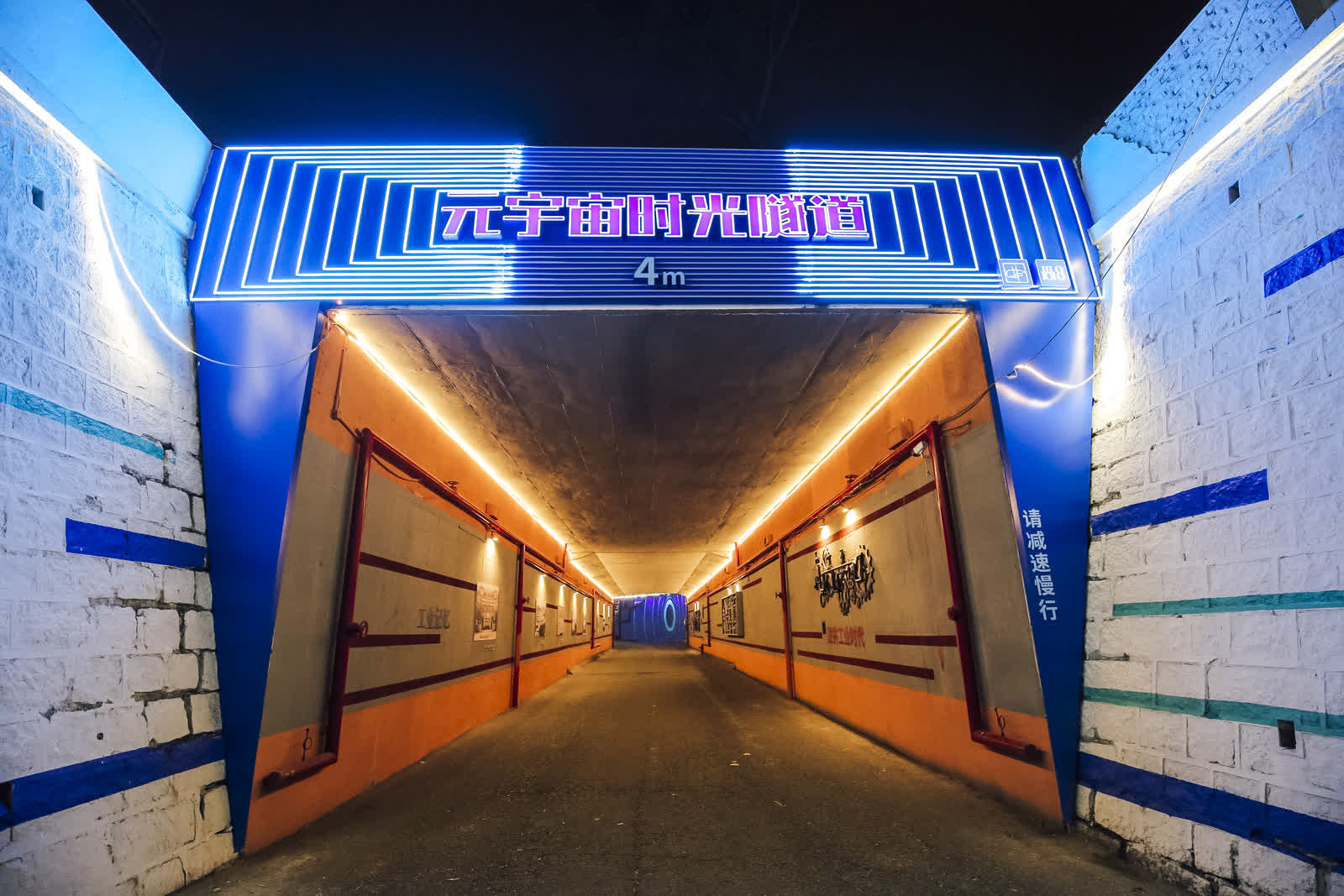 走近涵洞口,迎面就可見「元宇宙時光隧道」字樣,兩側牆壁被粉刷成天藍色,描繪有宇宙球體、數字代碼等圖樣,並張貼了轄區景觀治理效果圖等裝飾展板,凸顯出「穿越時光隧道、探尋宇宙之境」的設計理念。涵洞內分為元宇宙、工業歷史、現代街景、發展前景等多個主題展示區,牆壁上的手繪與燈光、展示板相呼應,形成光影交錯、移步換景的涵洞景觀,並增設了隔離欄、凸面鏡等設施,在「添美景」的基礎上更「增安全」。