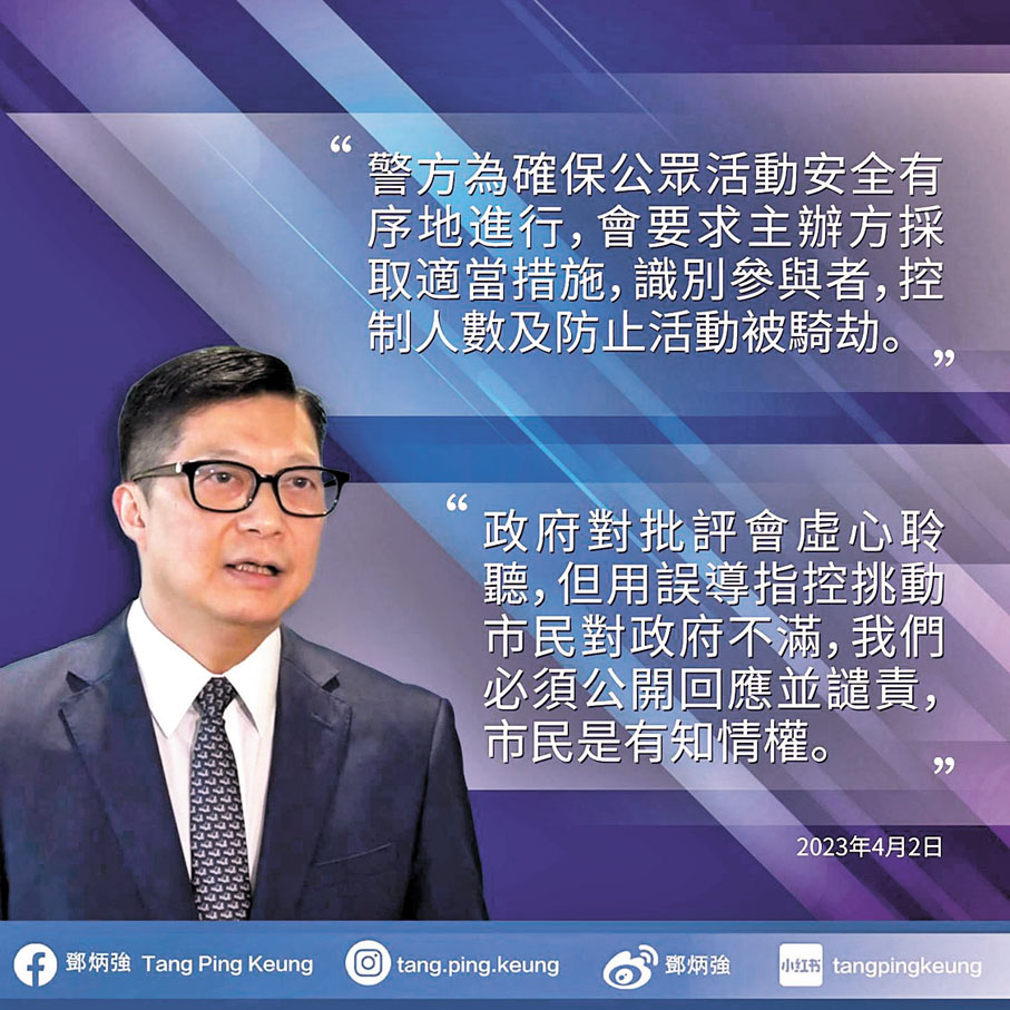 他表示,警方在批准有關公眾遊行或集會活動時,附加的規定和措施均是根據風險評估及與主辦單位商討後,作出的最合適和穩妥方法,以確保可以辨認到參加者,把參與人數控制在安全範圍內,防止一些別有用心的人騎劫活動,令活動得以順利、安全、和平地進行。