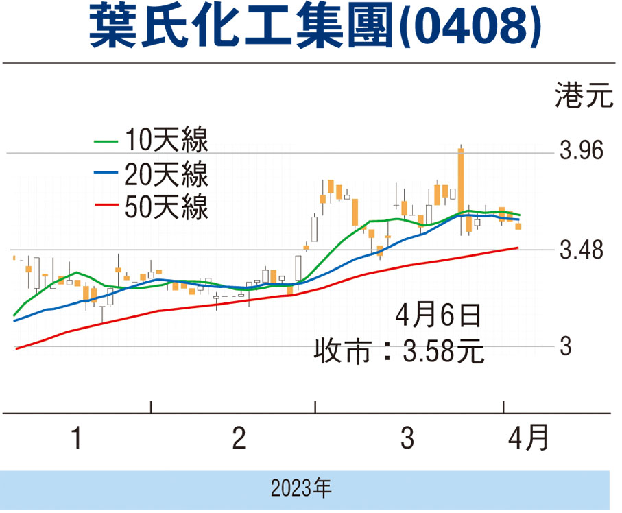 葉氏化工昨收報3.58元,跌1.1%,成交112萬元。現價按末期連特別息0.80元計(6日13日除淨),息率22%。伺機收集,上望4.70元。