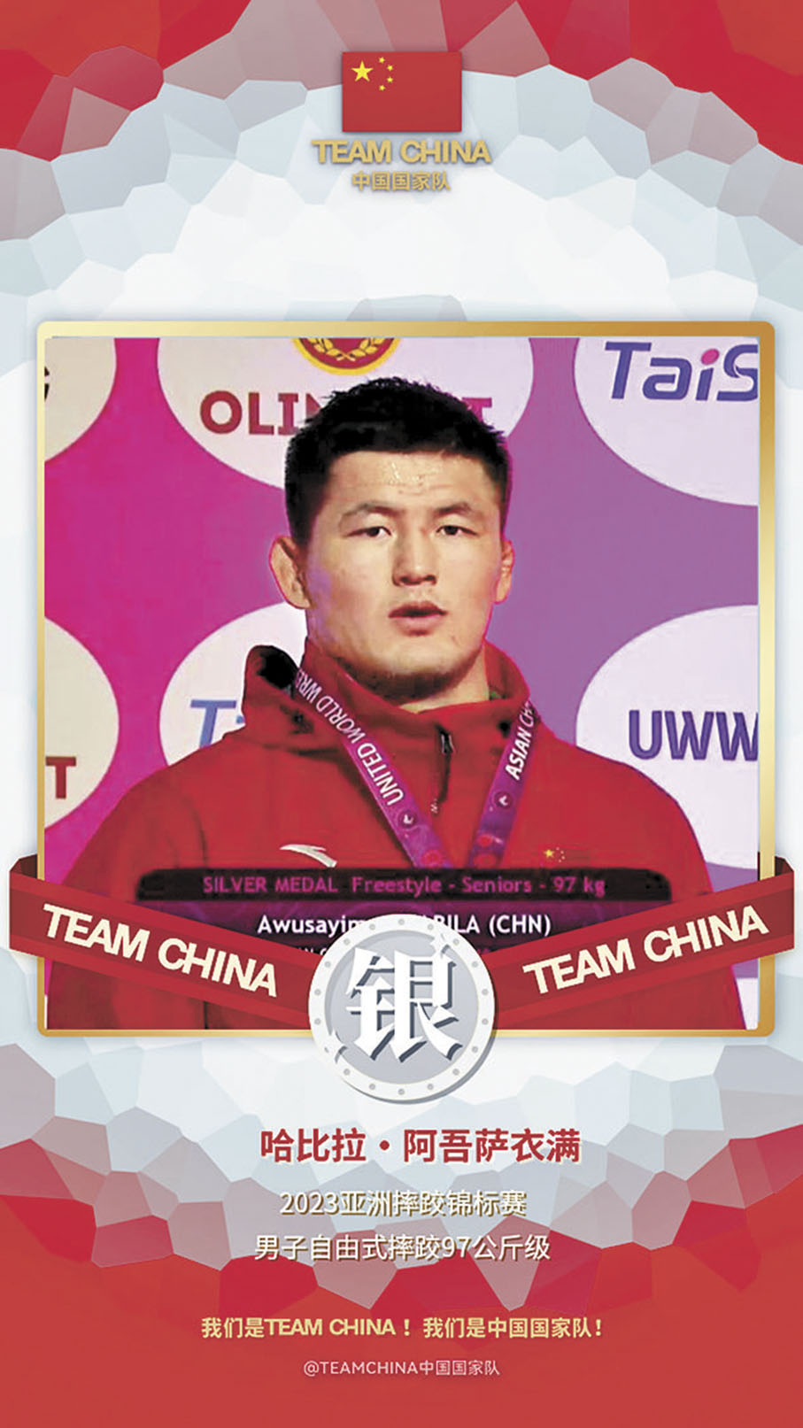 2023亞洲摔跤錦標賽當地時間13日在哈薩克首都阿斯塔納展開了男子自由式摔跤首個比賽日的較量,中國隊選手哈比拉·阿吾薩衣滿(左圖)在男子97公斤級冠軍爭霸戰,面對來自巴林的20歲小將塔朱迪諾夫,上半場,塔朱迪諾夫的進攻更為積極,利用衝抱腿技術連續獲得技術分值,半場結束即取得6:0的領先優勢。下半場,塔朱迪諾夫憑藉一記轉移和滾橋繼續得分,最終哈比拉·阿吾薩衣滿以0:11不敵對手,收穫該級別銀牌。 ◆新華社