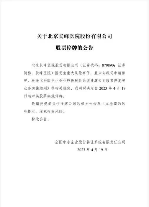 據中新財經報道,4月19日,全國中小企業股份轉讓系統有限責任公司發布公告稱,北京長峰醫院股份有限公司因發生重大風險事件,且未向公司申請停牌,根據《全國中小企業股份轉讓系統掛牌公司股票停復牌業務實施細則》等相關規定,公司現決定自2023年4月19日起對其股票實施停牌。